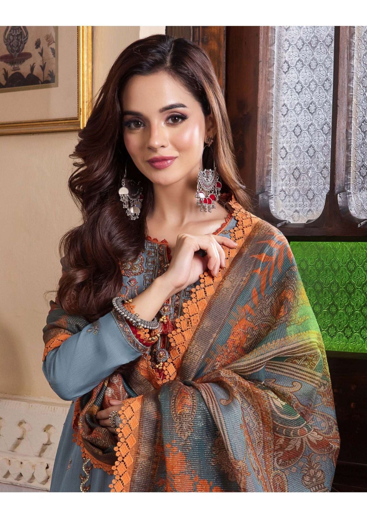 Step into timeless elegance with this sea foam blue ensemble, featuring a vibrant and classic design adorned with intricate threadwork in bold colors and exquisite zari work. The zari-lined dupatta draws inspiration from Greek art while maintaining a harmonious traditional touch, making this ensemble a captivating fusion of cultures and styles.