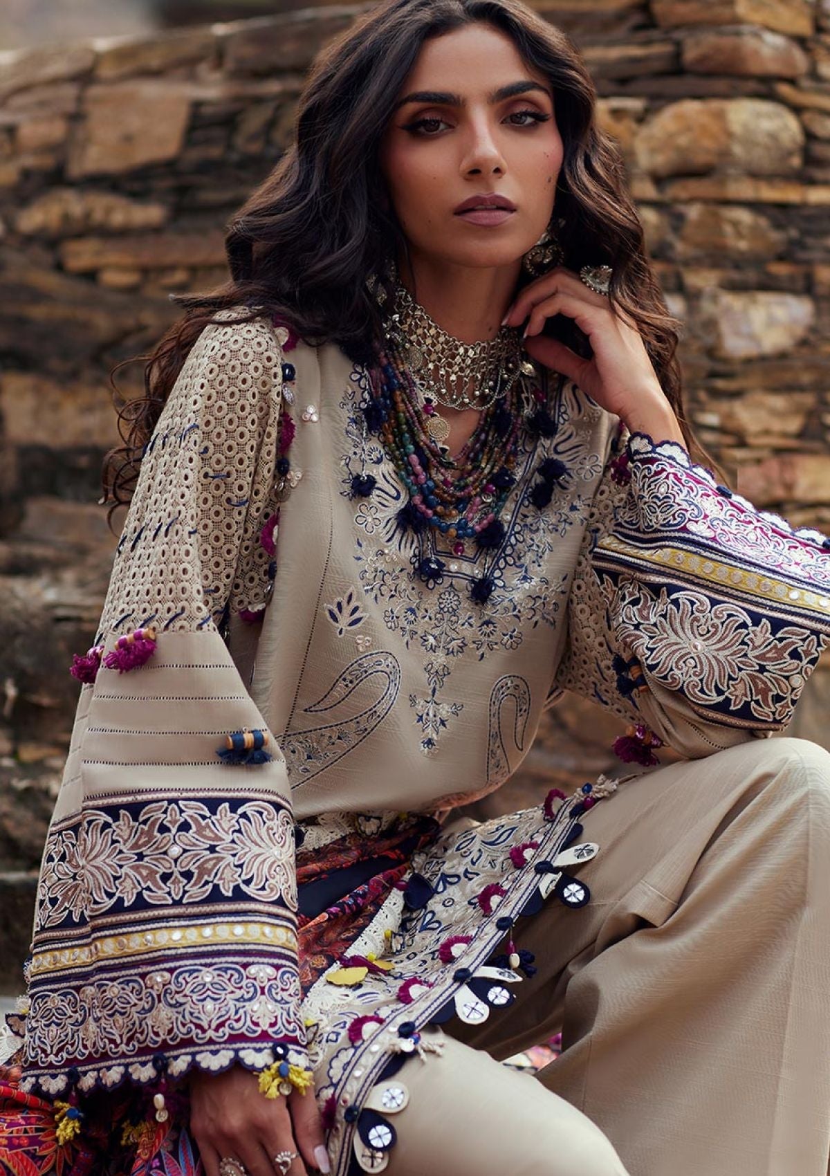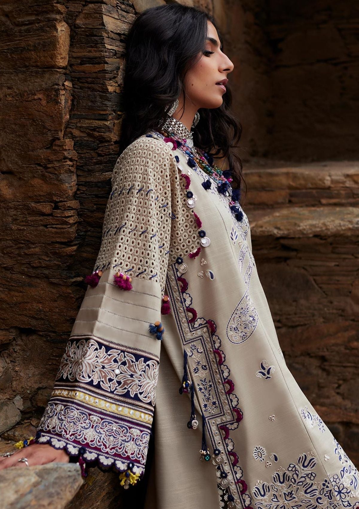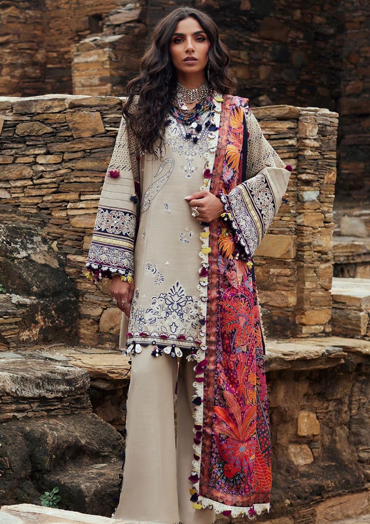 Introducing âÃÂÃÂArsia'âÃÂÃÂa luxurious masterpiece that effortlessly blends bohemian artistry with the refined elegance of winter. The rich, warm beige canvas is elevated by the earthy sophistication of intricate tribal embroidery. Delicate motifs in ivory, frost blue, and florentine are meticulously crafted, telling a timeless story of craftsmanship that seamlessly merges the essence of winter with free-spirited allure.Paired with a contrasting printed silk dupatta, this ethereal ensemble strikes the perfect balance between modernity and tradition.