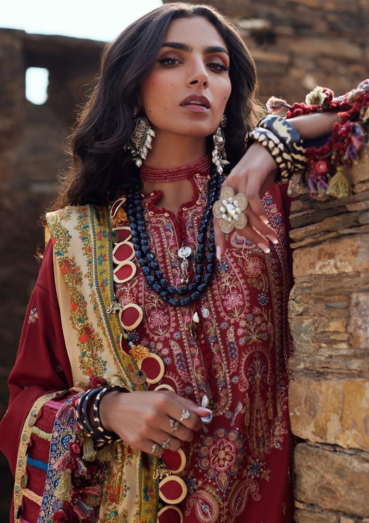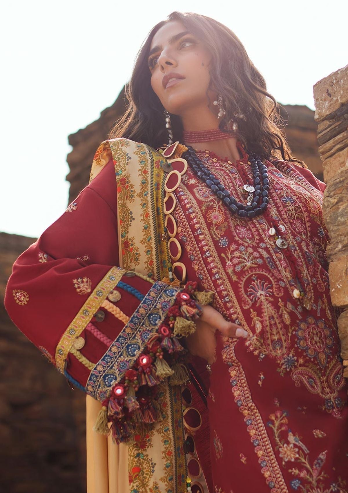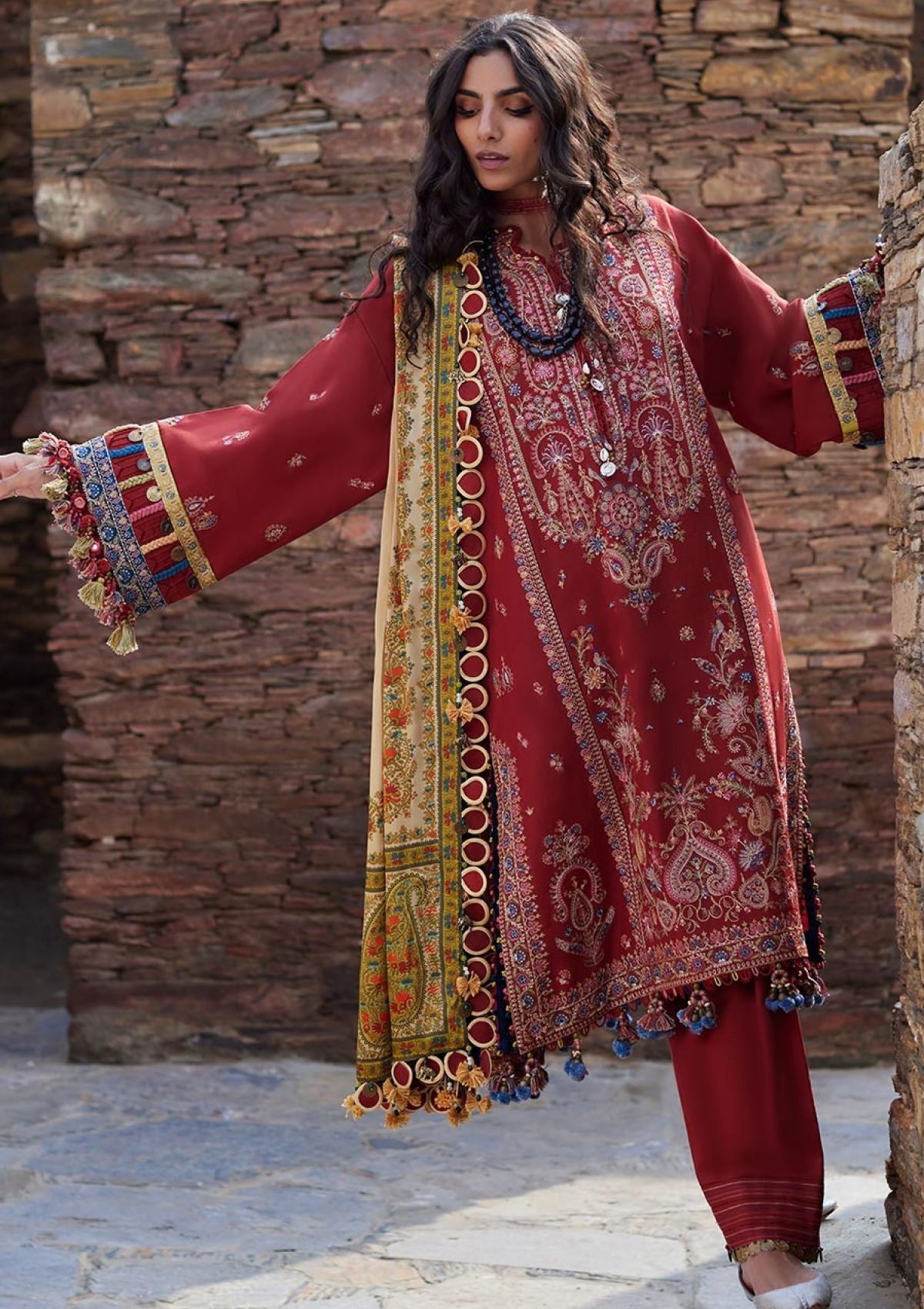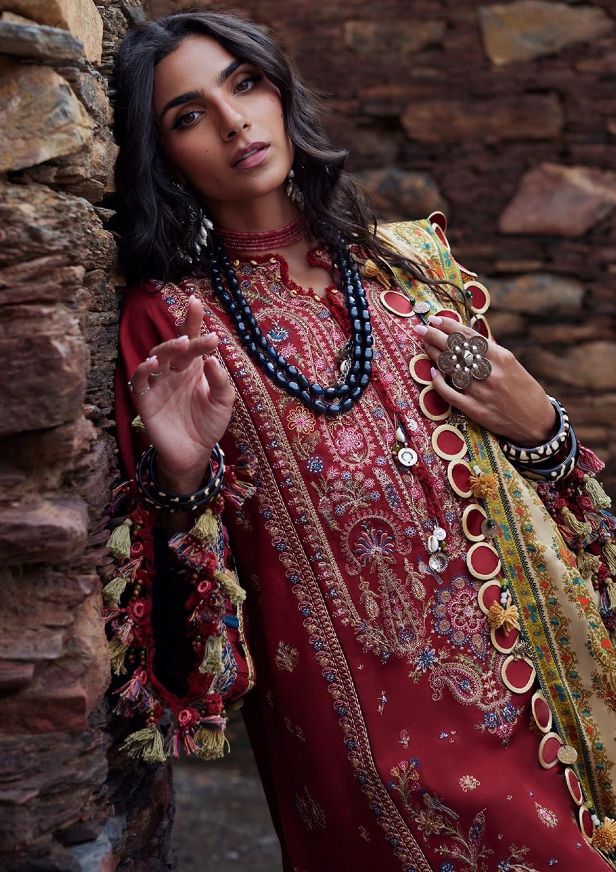 Paired with a luxurious ivory-beige silk dupatta, delicately detailed with a printed motif border, Elnaz becomes a masterpiece that transcends mere fashion. It is a visual symphony of warmth and sophistication, capturing the essence of winter's elegance and a deep connection to heritage. This stunning creation is not just an outfit but a refined work of art, destined to be the crown jewel of any curated wardrobe.