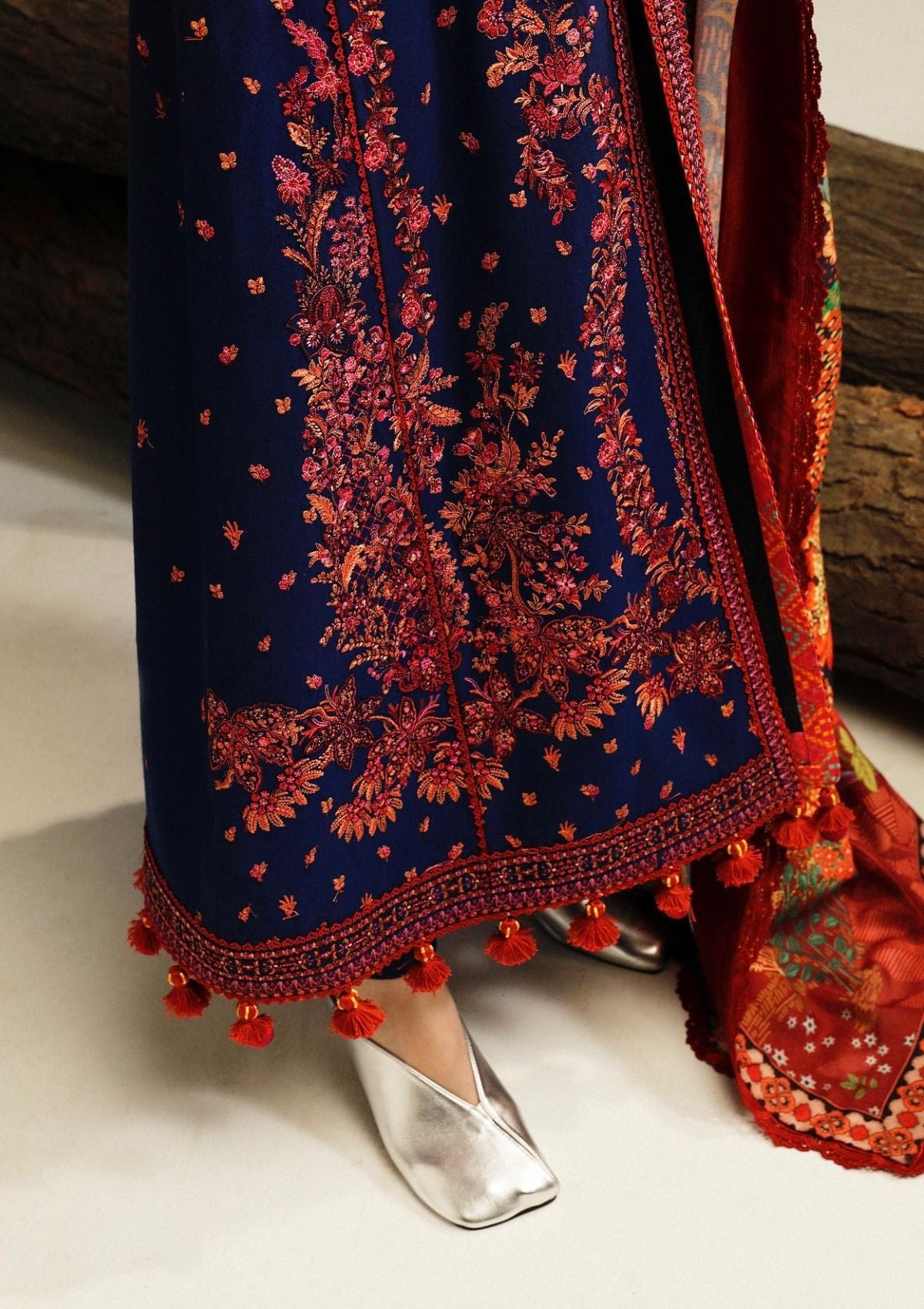 This classy navy blue front-open shirt with four panels, each adorned with beautiful embroidery in shades of red and orange, creates a stunning visual contrast. To add an extra touch of elegance, there is a waistcoat that perfectly complements the shirt. And for a complete look, there is a gorgeous abstract-style printed shawl that adds a unique element to the outfit.