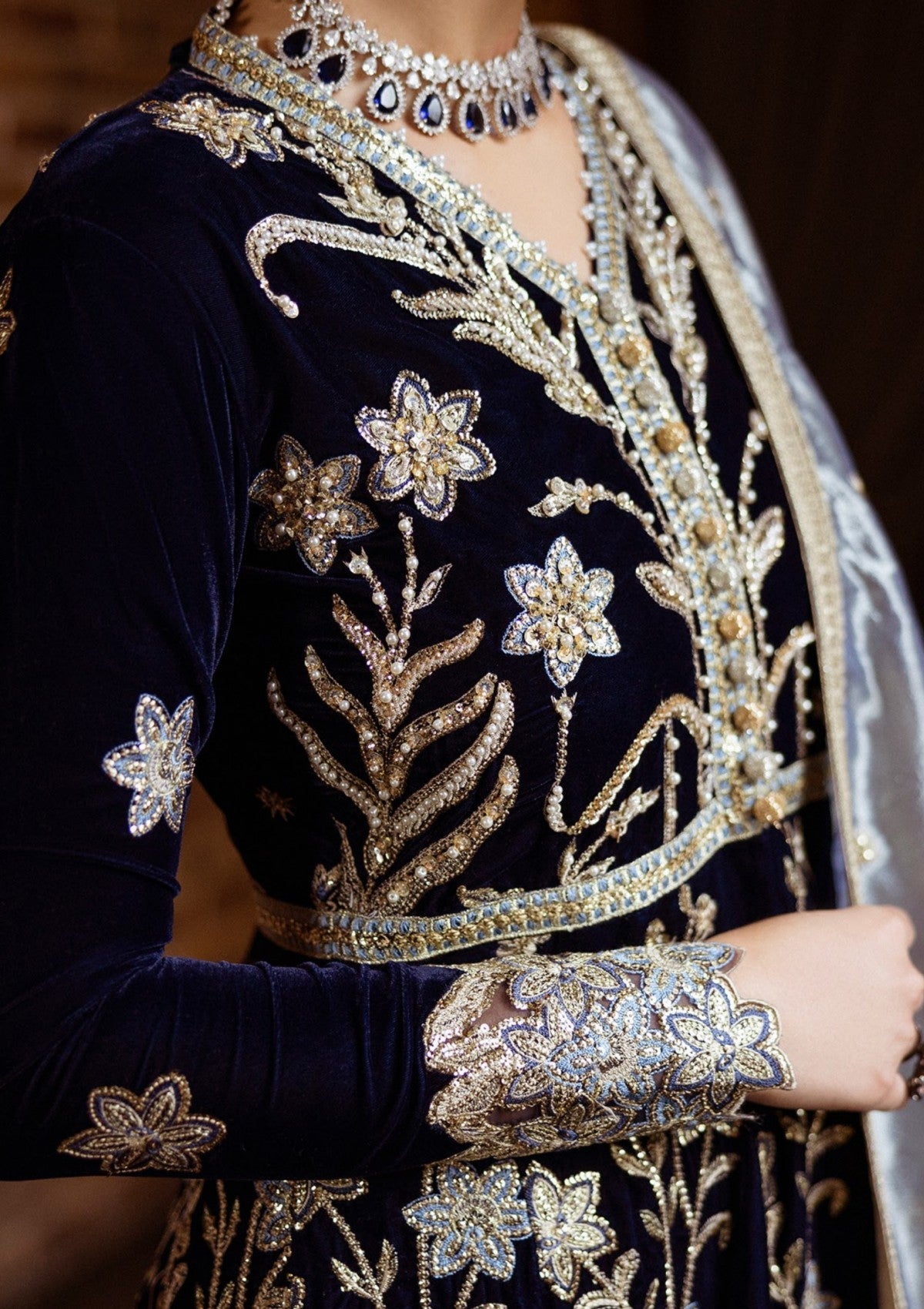 - Embroidered, sequinned and hand embellished velvet for front yoke