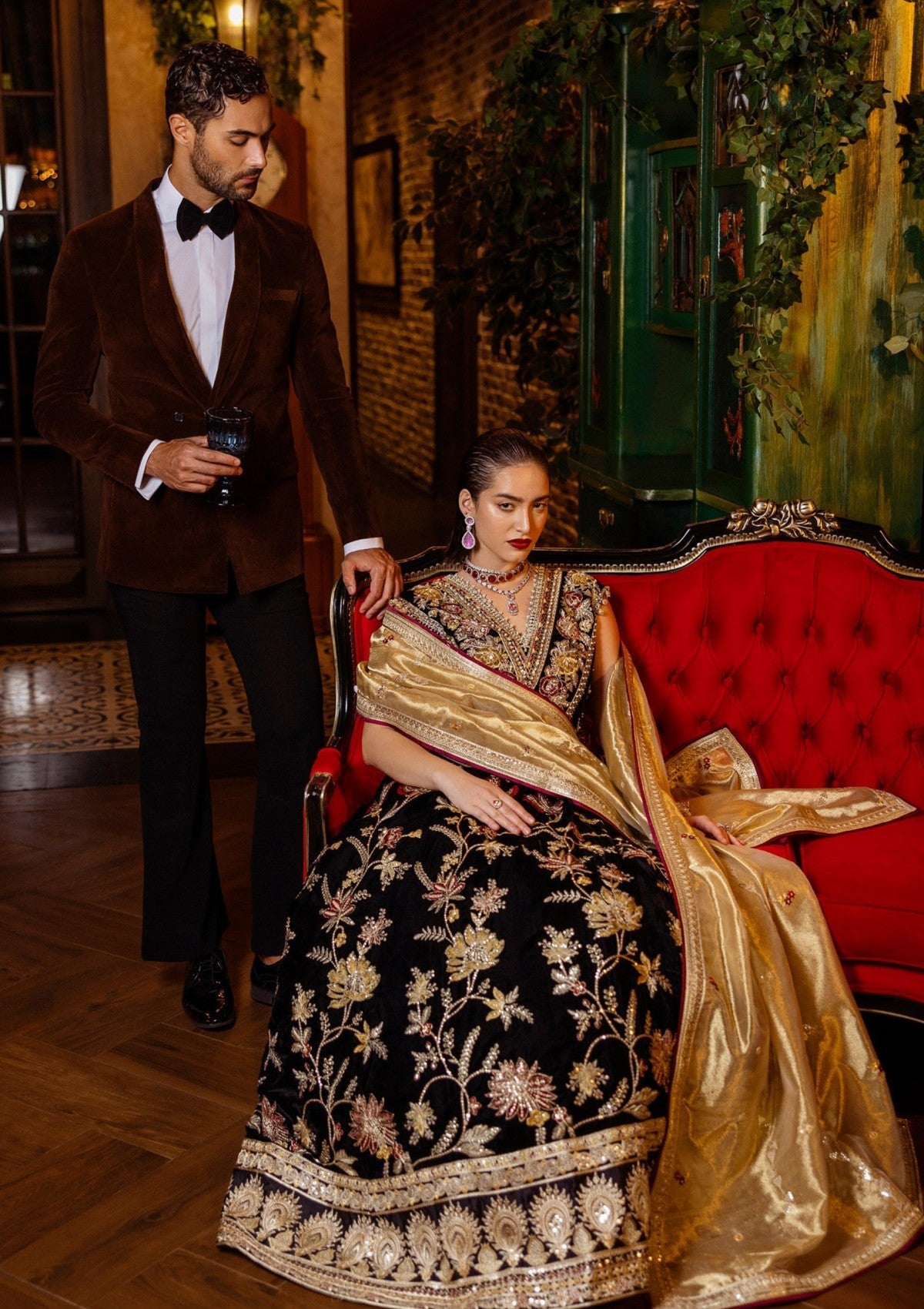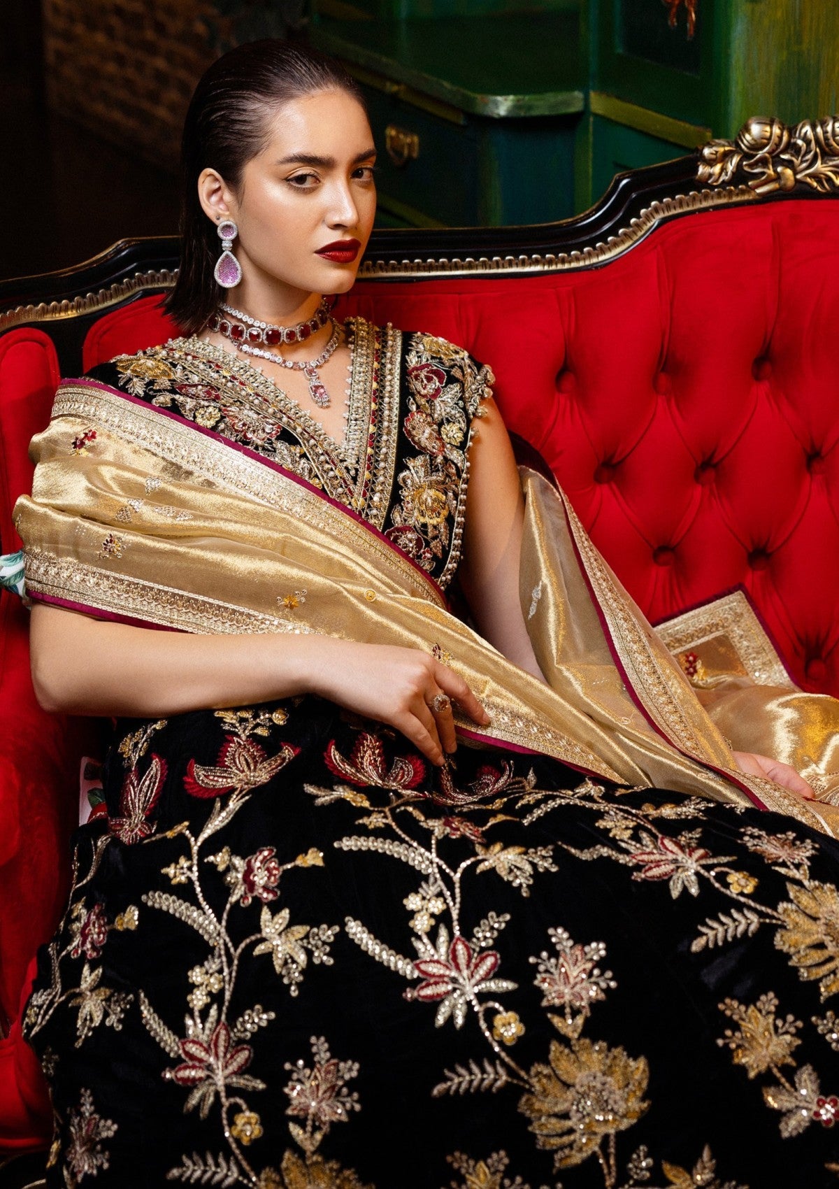 - Embroidered, sequinned and hand embellished velvet for front yoke
