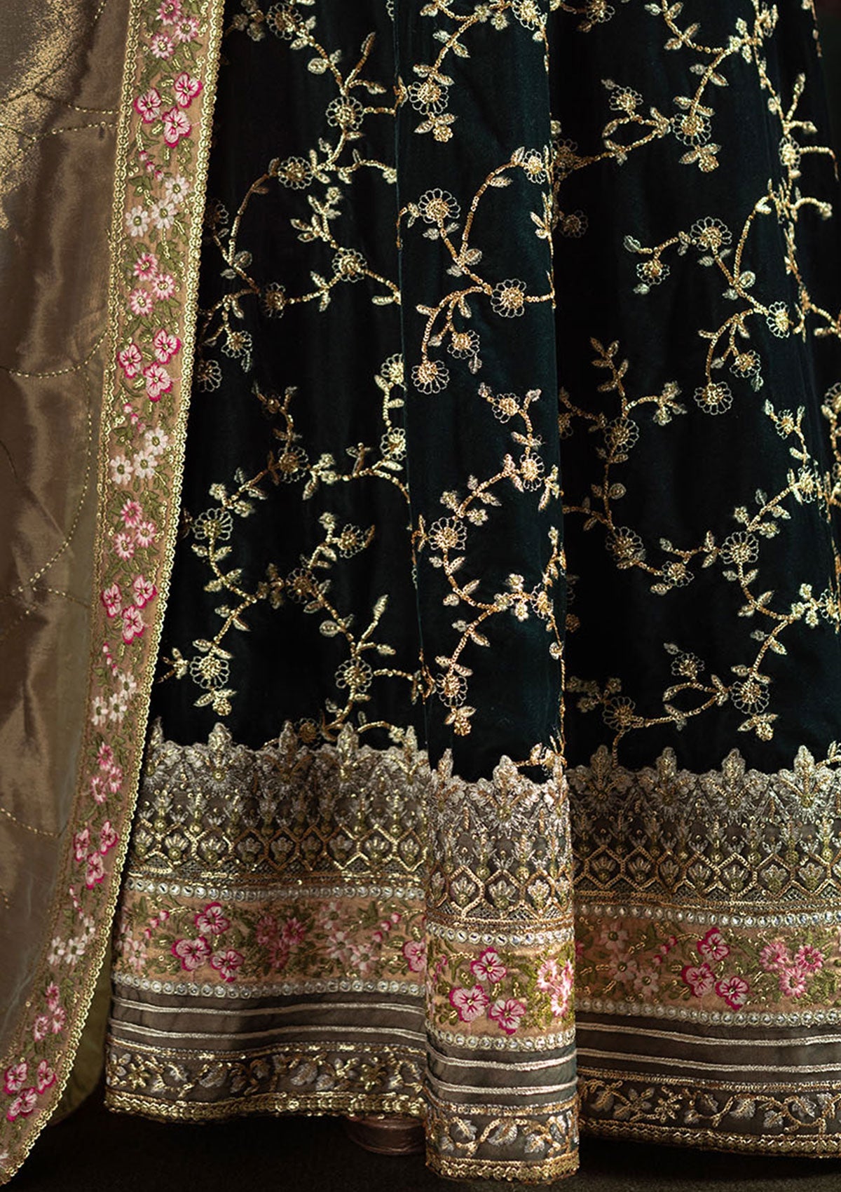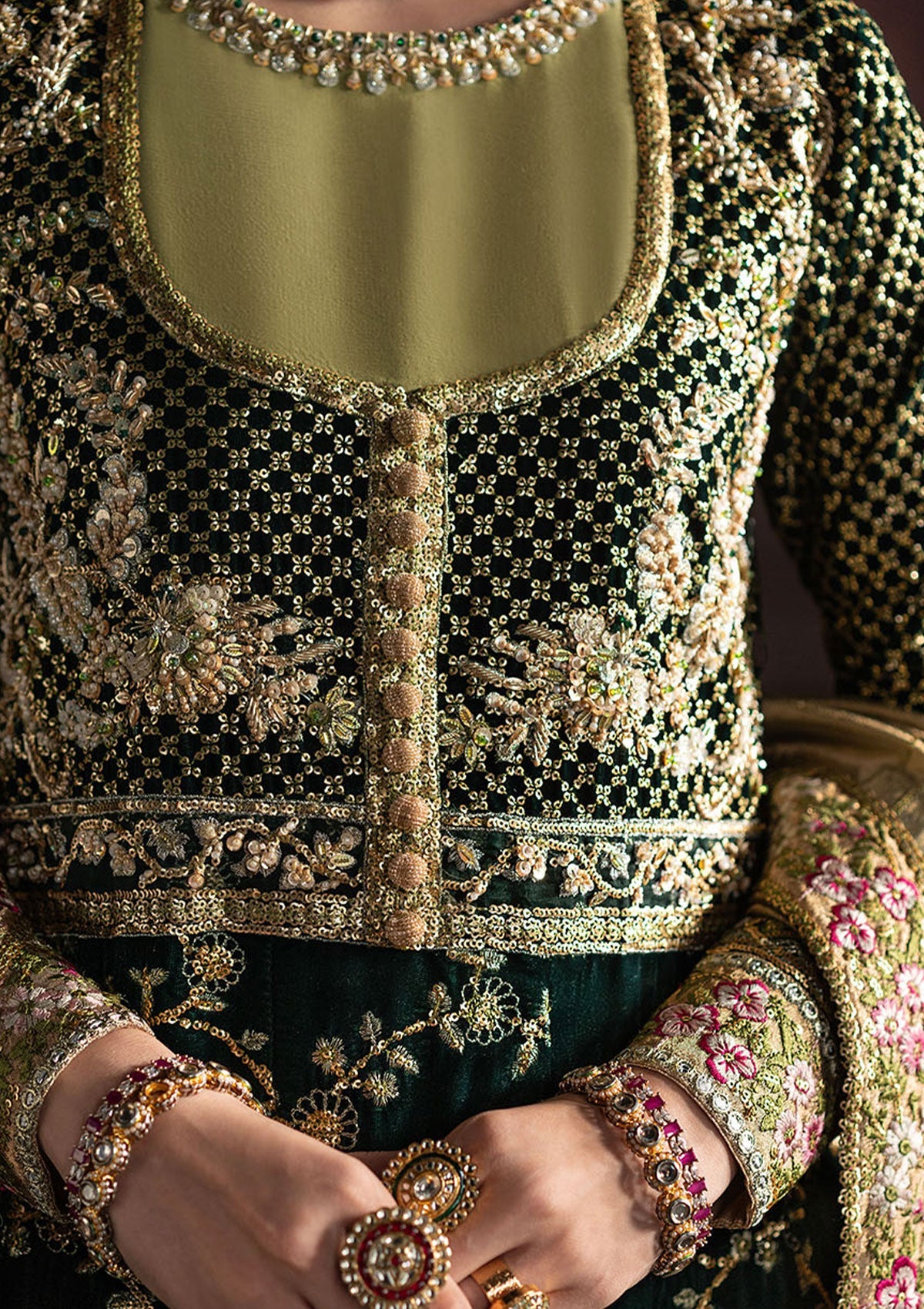 - -Embroidered, sequined and hand embellished velvet for front yoke