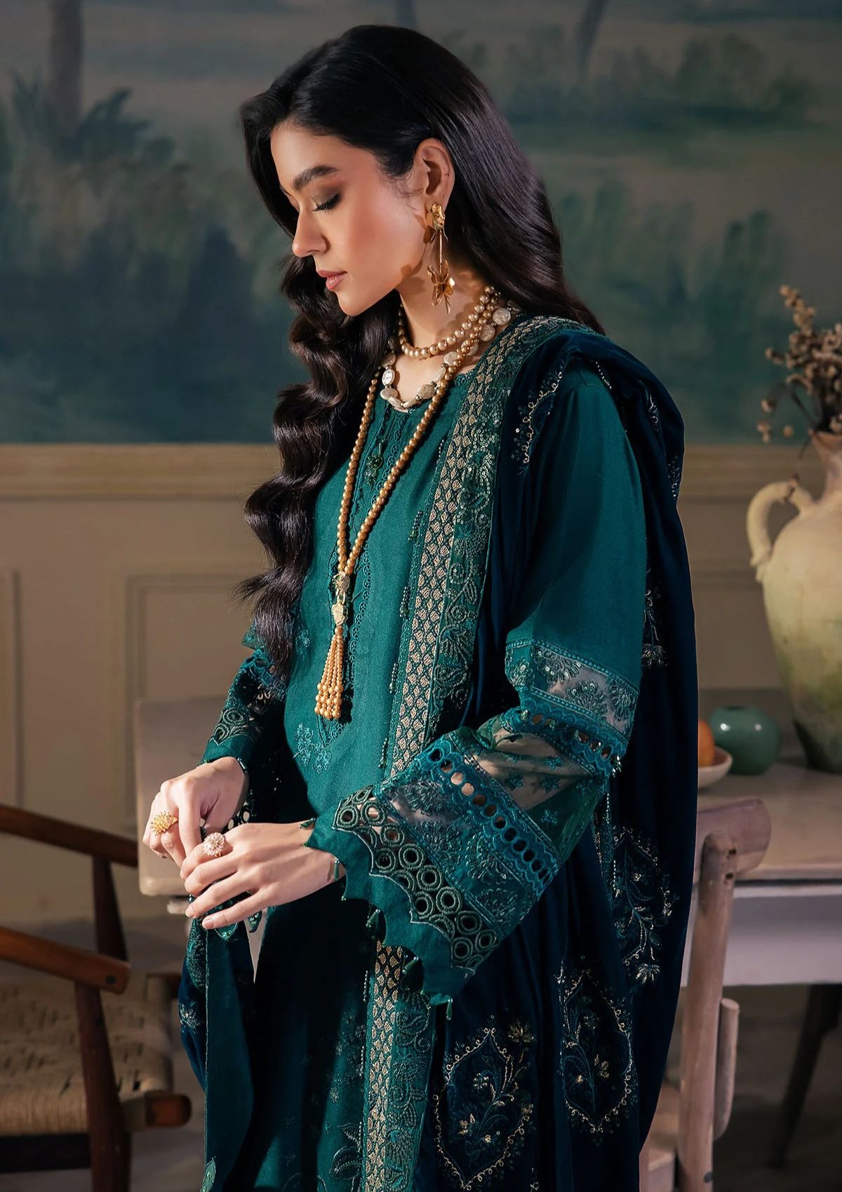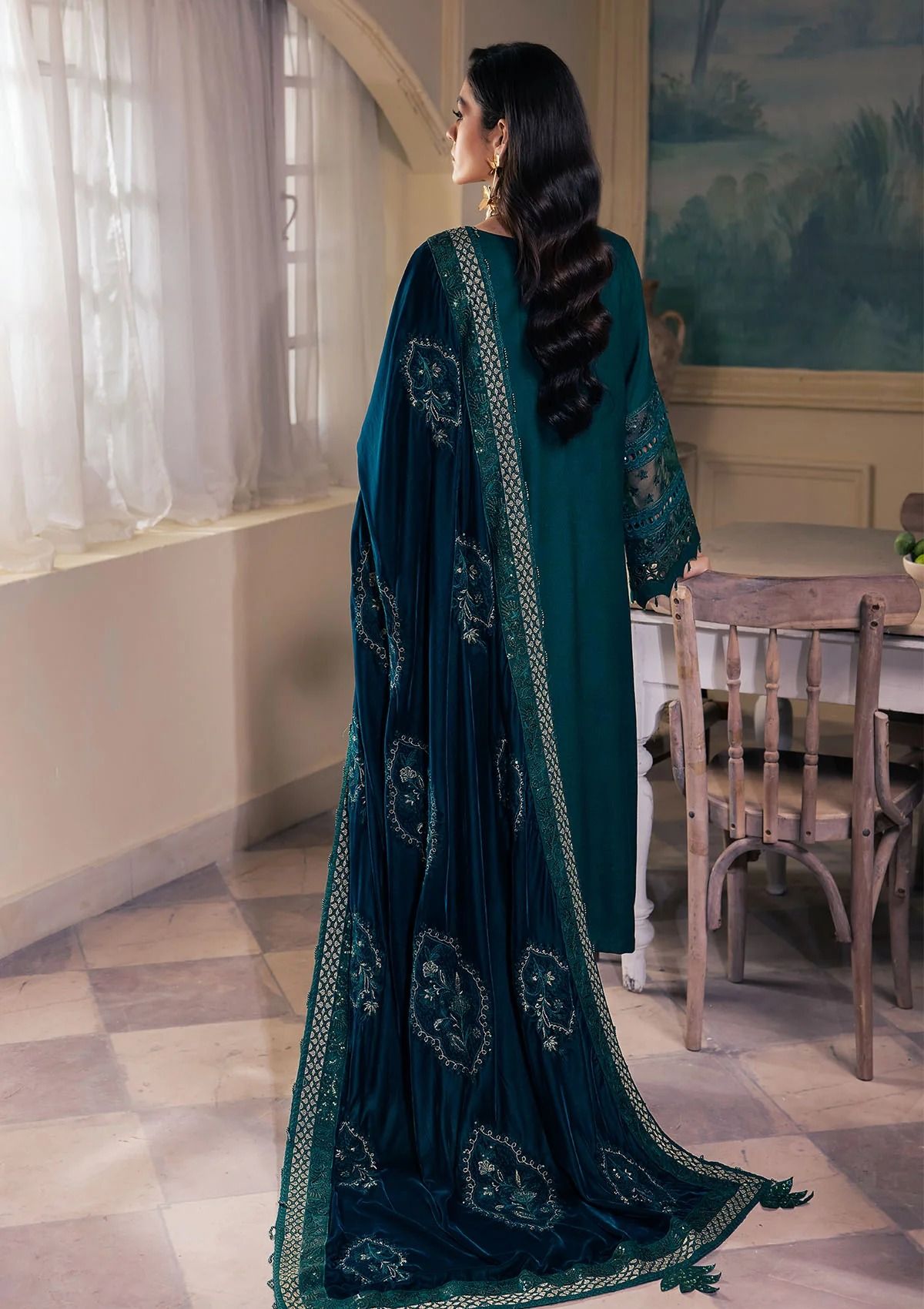 - Embroidered Velvet Shawl With 4 Side Embroidered Rawsilk Border