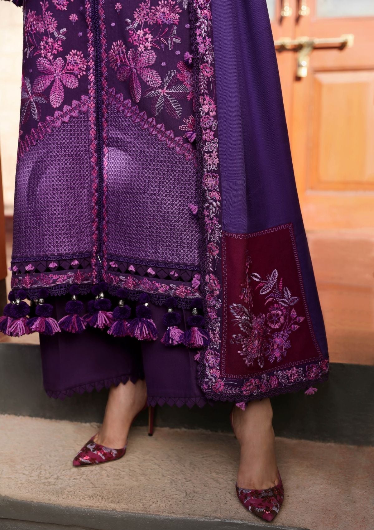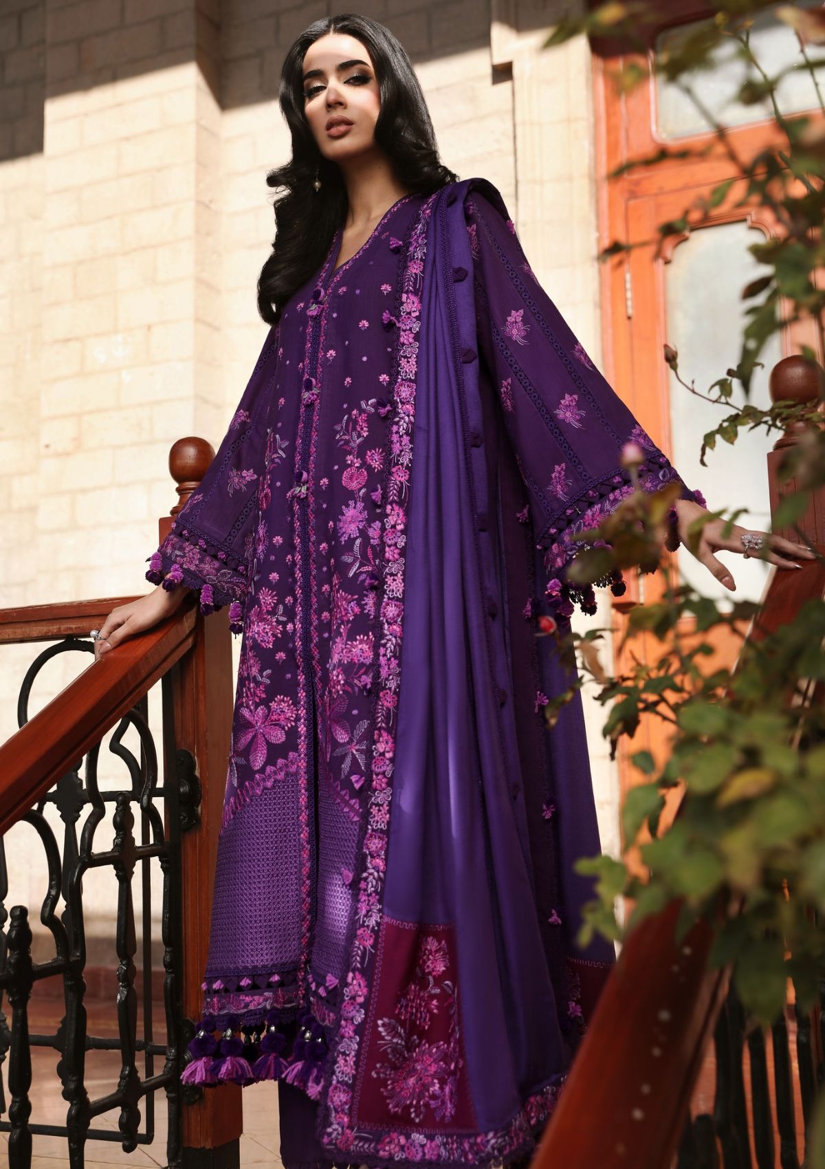 Expressing both intensity and opulence, this stunning plum canvas portrays a fervent longing to indulge in a captivating floral embroidery design, enhanced with bold kantha stitches and a schiffili pattern along the hem. The fine purple pashmina shawl, featuring satin stitches and Parsi Gara embroidered four sided borders with contrasting boxes on both the sides, is a valuable and stylish addition to your winter wardrobe.