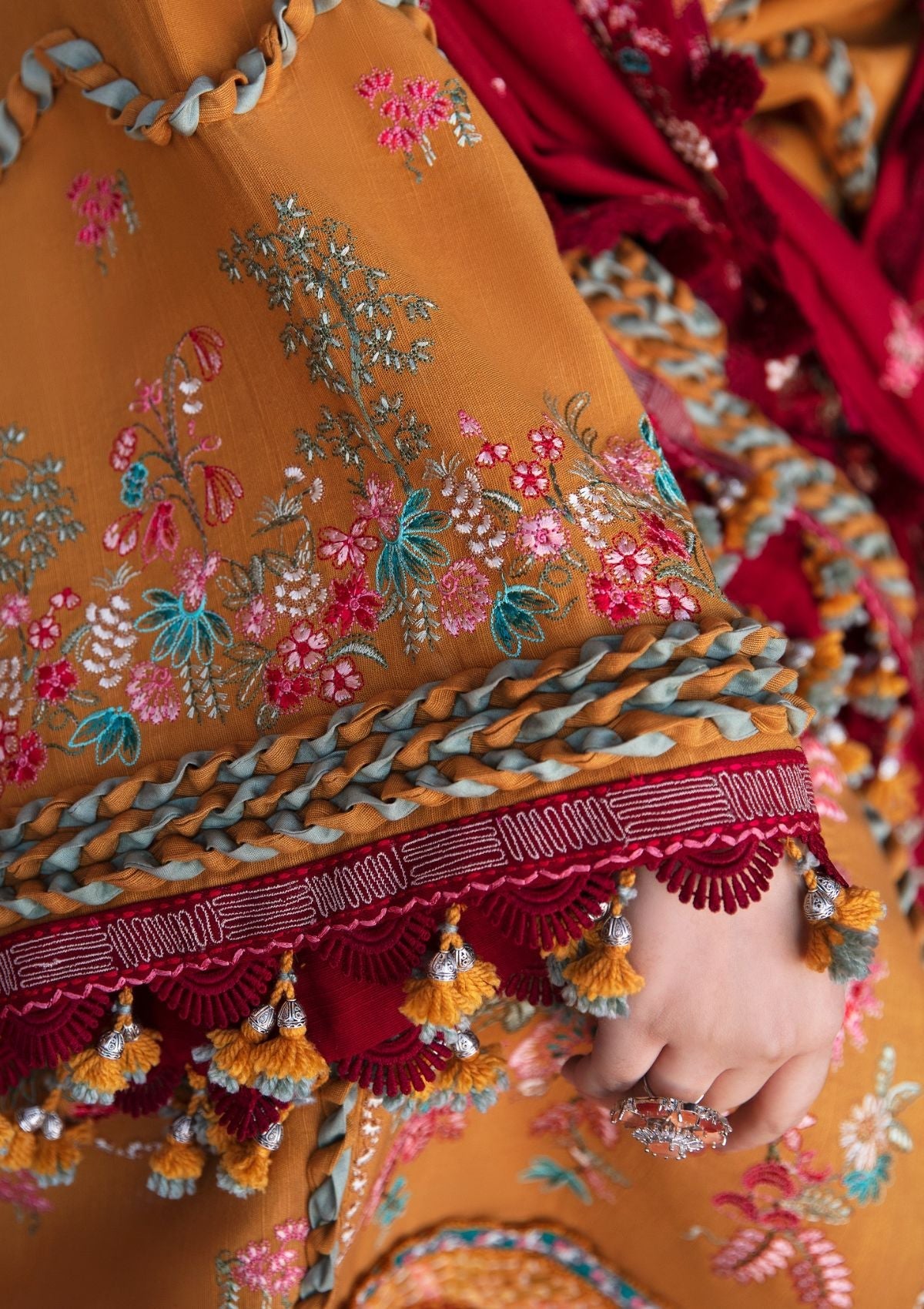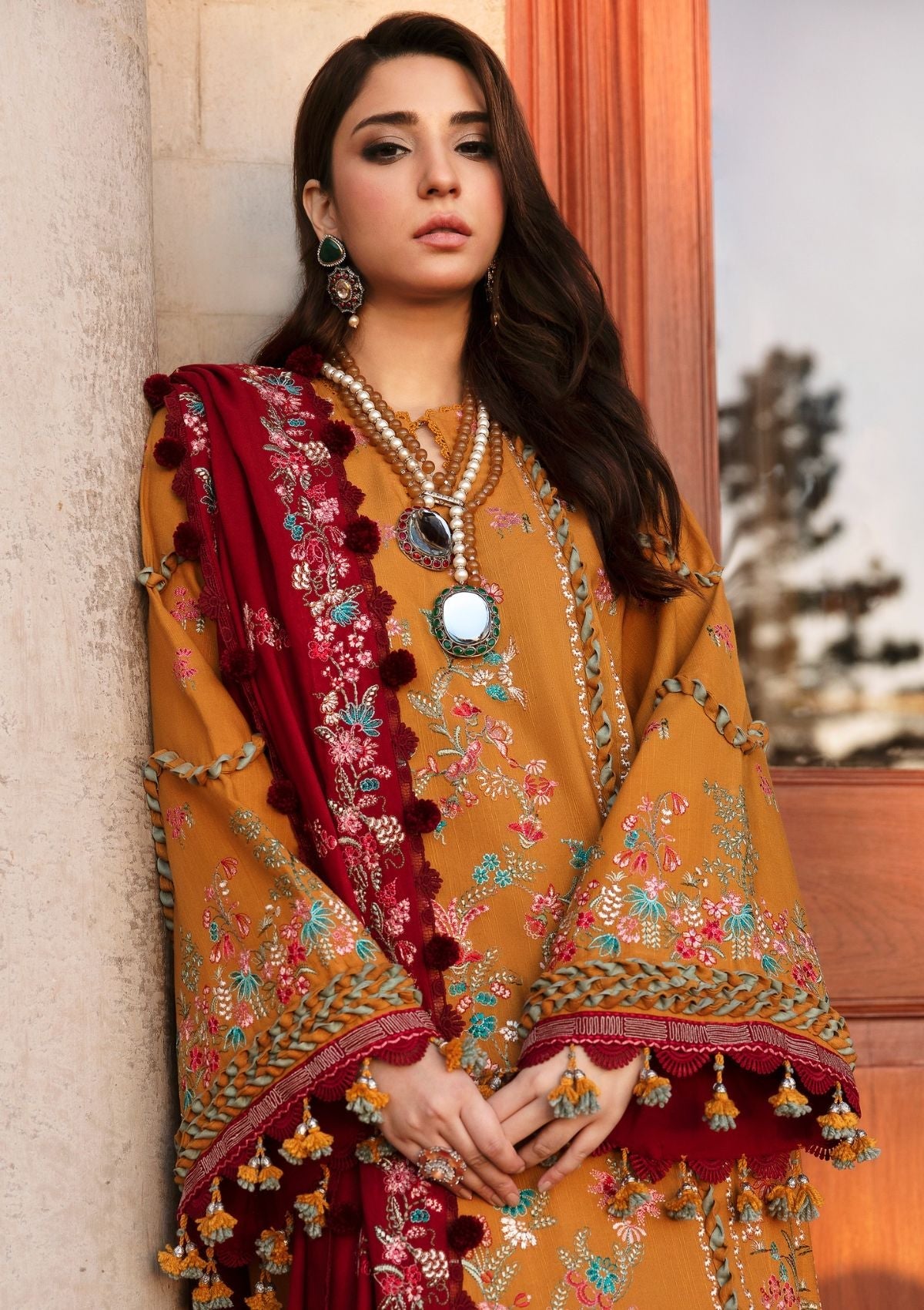 A three panelled mustard shirt unfolds, decked in resplendent allure and graced by the presence of intricate floral motifs engraved onto a radiant tapestry of mustard khaddar. Masterpiece unfolds, adorned with the artistry of satin stitches with intricate floral multi colored embroidery with acrylic shawl, elevated to extraordinary heights by a daring and swirling four sided floral embroidery adorned with vivid hues.