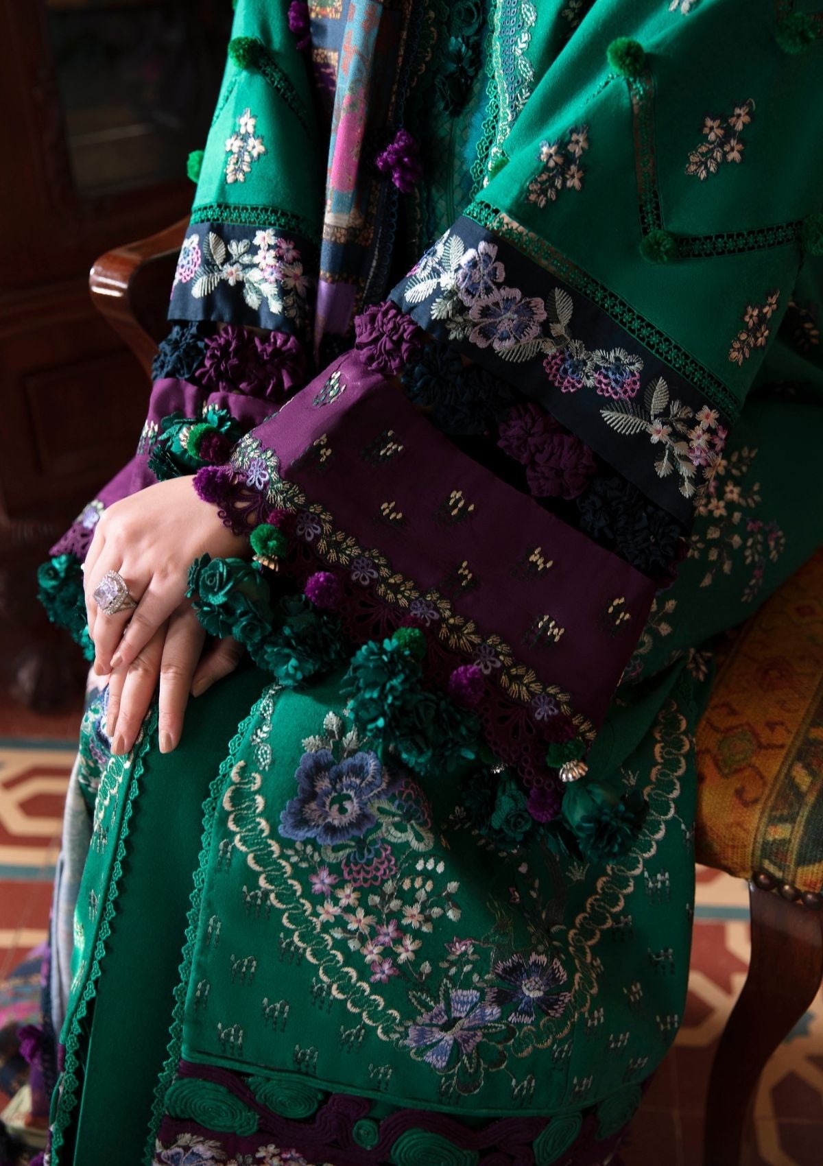 The beguiling interplay of green, purple, pink hues within this ensemble crafts a genuinely captivating silhouette. The design is adorned with exquisite detailing, featuring intricate floral and leafy patterns meticulously embroidered on rust khaddar fabric, adding a nuanced touch of elegance to the overall aesthetic. The impeccably coordinated printed floral pashmina shawl serves as the consummate finishing touch, elevating the ensemble to a pinnacle of refined sophistication.