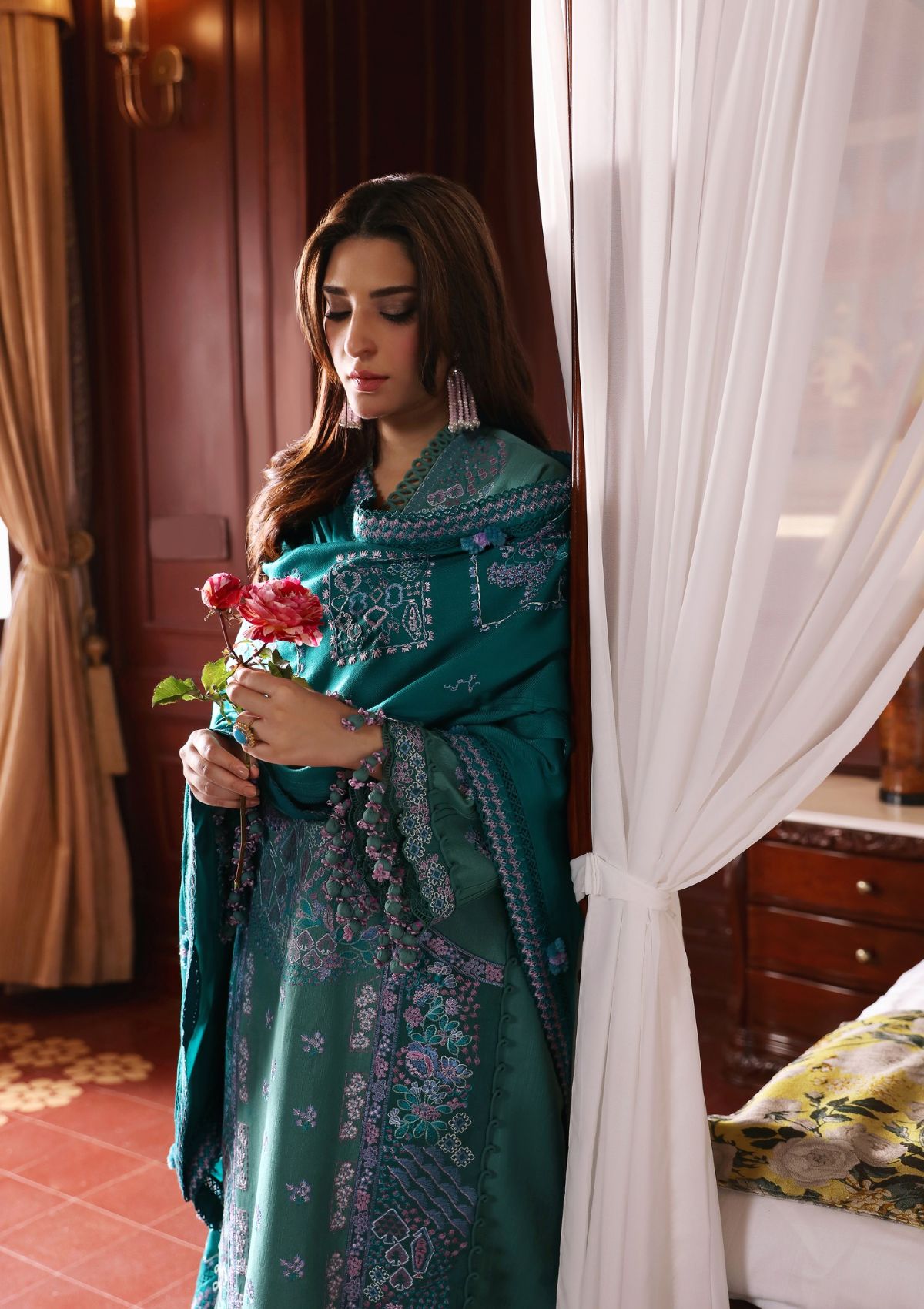 Indulge in confidence and fashion with this aquamarine khaddar shirt, embellished with a captivating floral motif in lilac and teal green embroidery, showcasing intricate details that are undeniably stunning. The shirt effortlessly blends modernity with style, incorporating subtle touches of refinement and elegance. Paired harmoniously with an acrylic shawl, this ensemble constitutes a magnificent addition to your wardrobe. The delicate embroidery and the enchanting design render it a compelling choice for a spectrum of occasions. Embrace your sense of fashion and revel in the timeless beauty of this botanical inspired masterpiece.