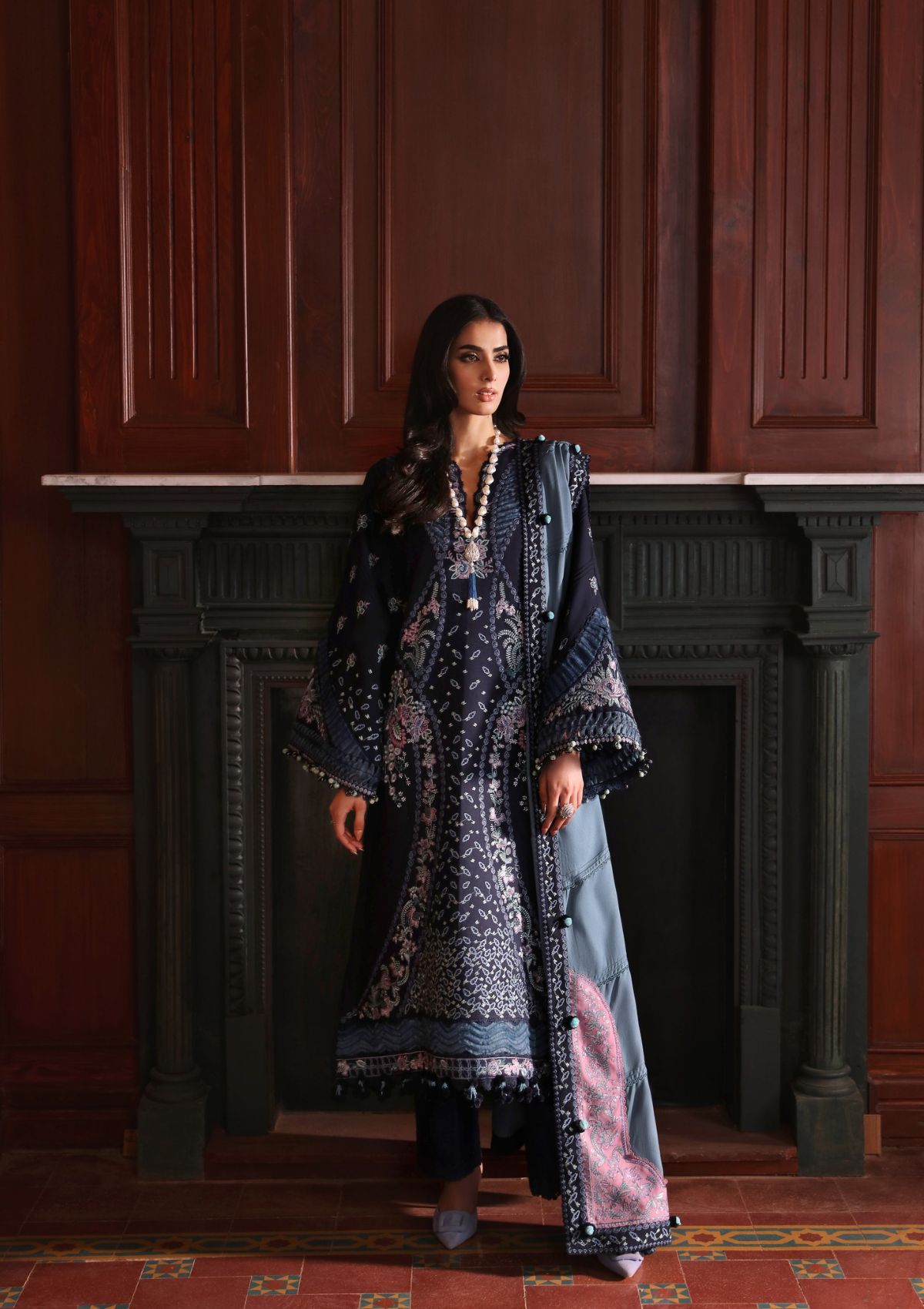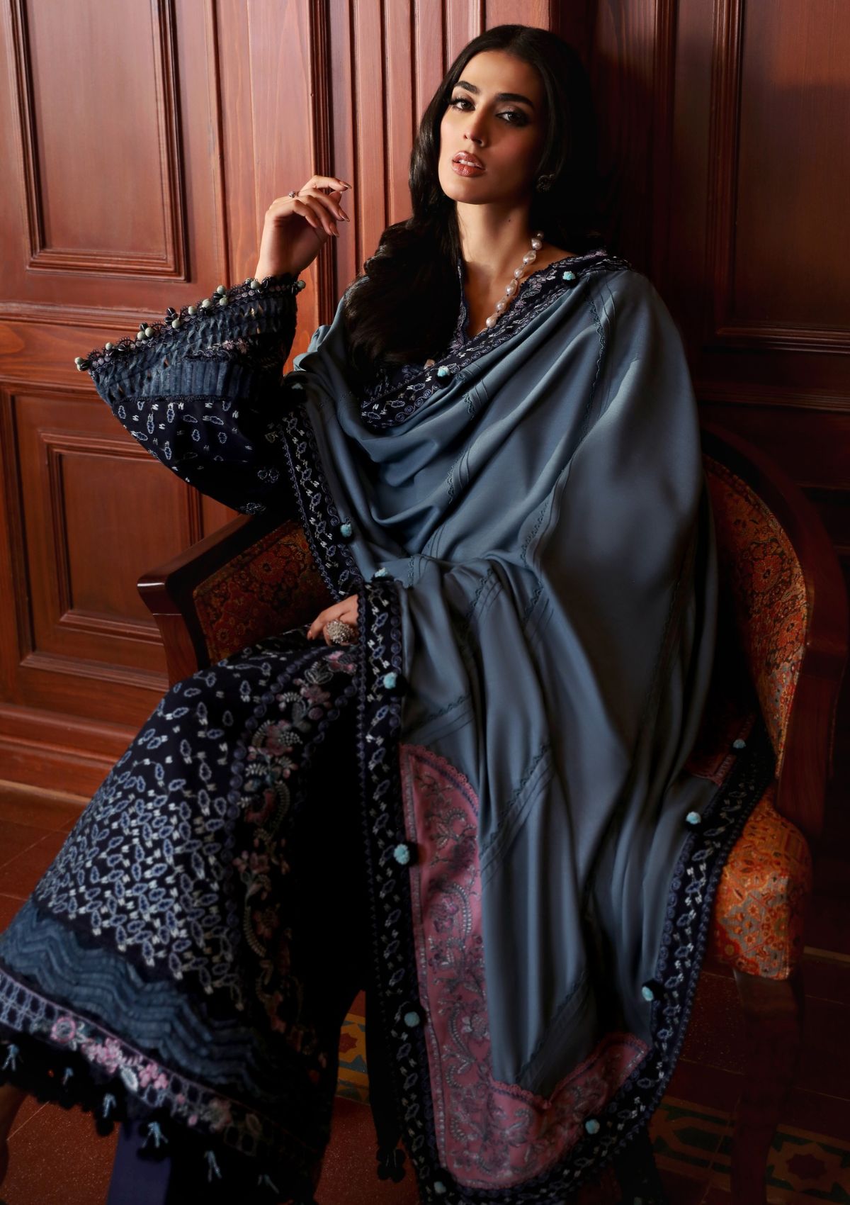 Captivating and extraordinary, this elegant navy blue ensemble showcases intricate craftsmanship, meticulous geometric and delicate floral arrangements, and precise stem stitches in a thoughtfully designed structural layout. It is complemented by a contrasting grey pashmina shawl featuring four-sided borders and arches on both sides, adding an extra layer of sophistication to the overall ensemble.