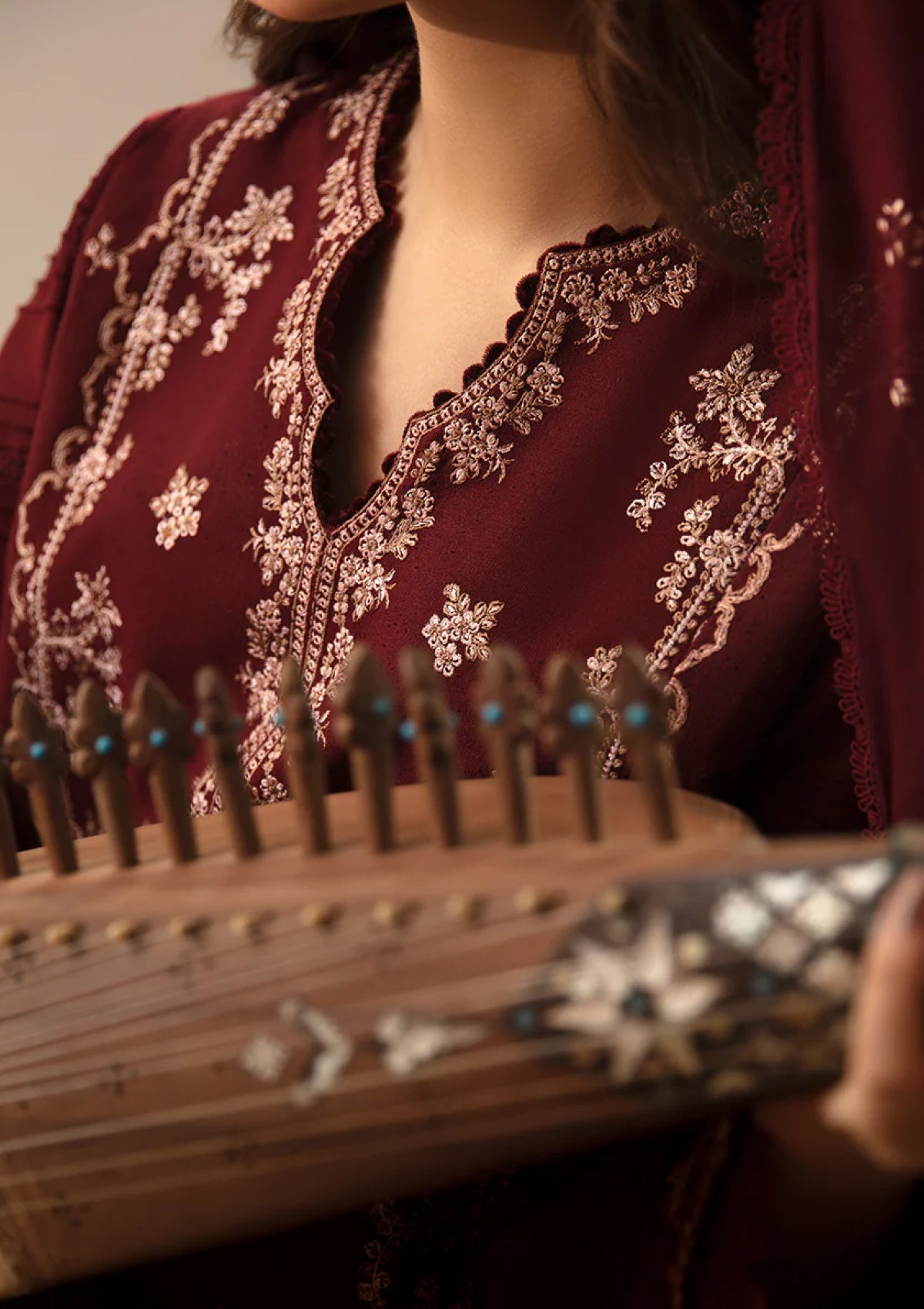 Embrace confidence and style with this elegant wine-colored shirt, designed with a chic three-panel structure and adorned with Kashmiri floral and ornamental embroideries in muted maroon tones. The intricate detailing adds a stunning touch, seamlessly merging modern flair with refined elegance. Complemented by a beautifully hand-stitched Kashmiri shawl in soft beiges and browns, this ensemble is a magnificent addition to any wardrobe. The exquisite embroidery and captivating design make it a versatile choice for various occasions. Celebrate your fashion sense and enjoy the timeless beauty of this exquisite creation.