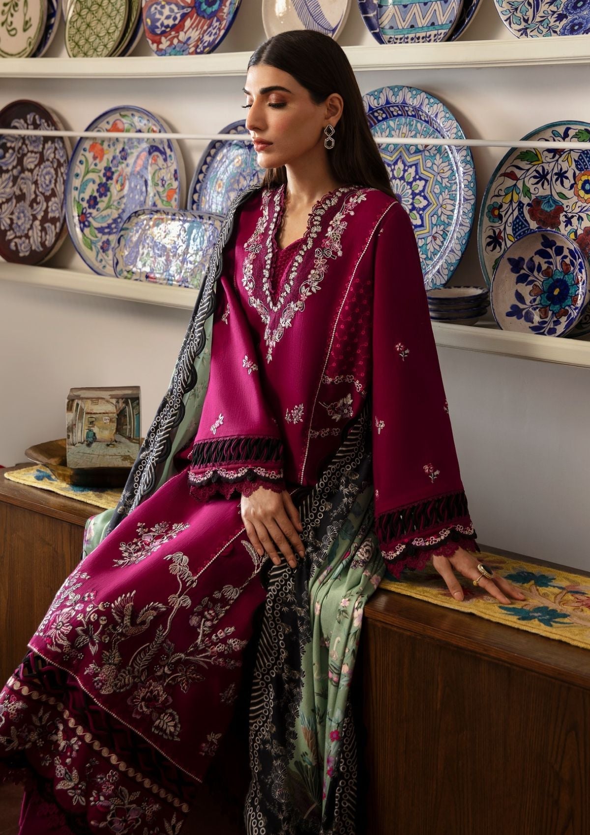 A magnificent deep fuchsia canvas emerges, adorned with botanical florals and tribal elements rendered in enchanting black tones, accented by bright splashes of berry, rogue, mauve pink, and black. Drawing inspiration from rich ethnic cultures and design philosophies, it features a border intricately layered with multicolored thread work, creating a captivating composition. Accompanied by a luxurious Viscose shawl that bursts with a stunning array of colors and imagery, this vibrant ensemble is sure to make a striking statement this winter.
