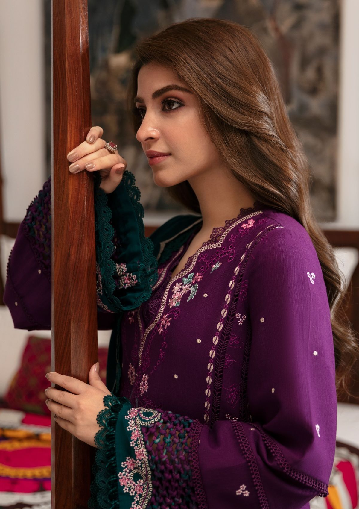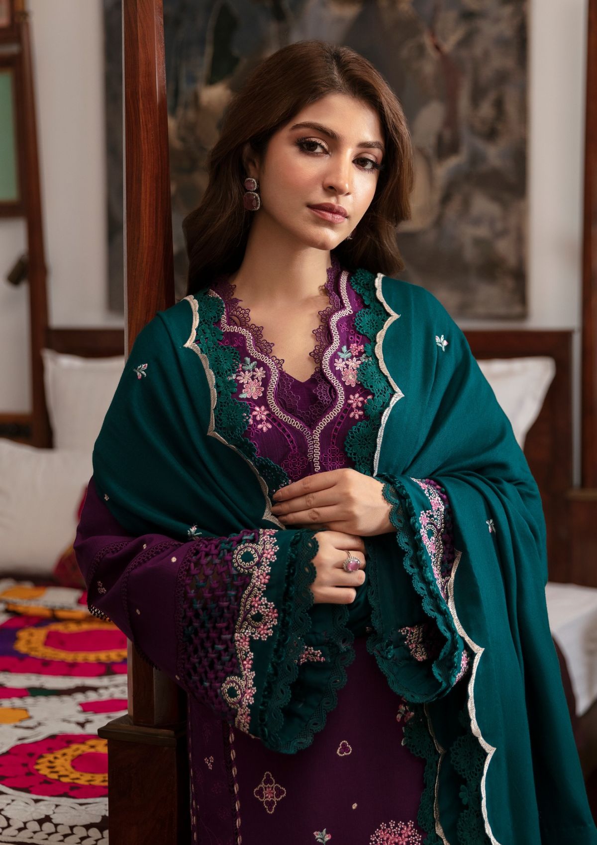 Delicate and textured taankas intricately showcase folk tribal embroideries in vibrant shades of magenta, jade green, ivory, and pink, accented with hints of teal for a striking color against the deep magenta canvas of âÃÂÃÂMirea.âÃÂàPaired with a contrasting deep teal Viscose shawl that showcases playful scallop details in beige hues, this ensemble celebrates an array of textures and embroideries, enhancing both comfort and sophistication. This fusion of intricate embroidery and tribal elements creates a captivating look that harmonizes timeless elegance with contemporary flair, offering a unique expression of style and confidence.