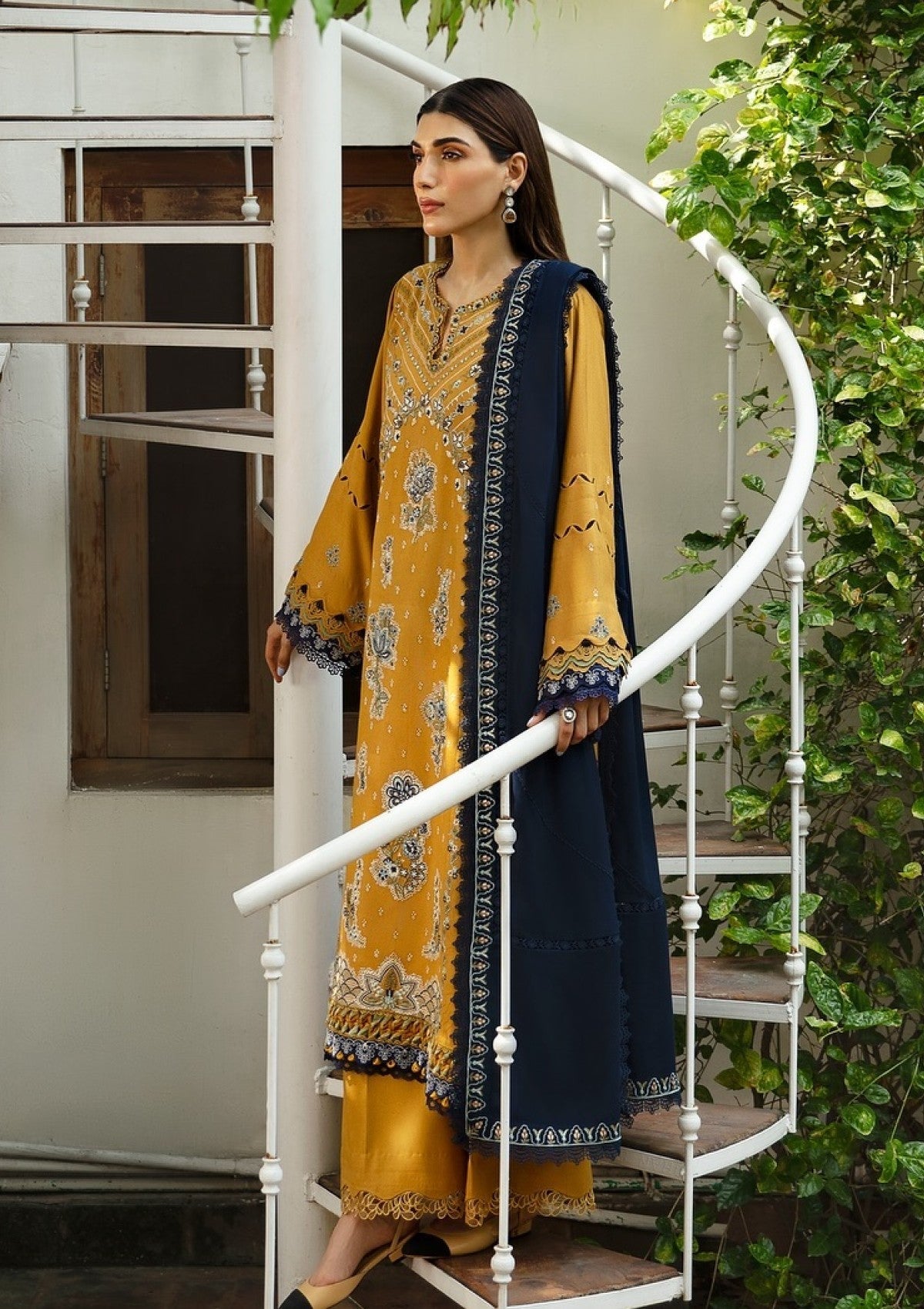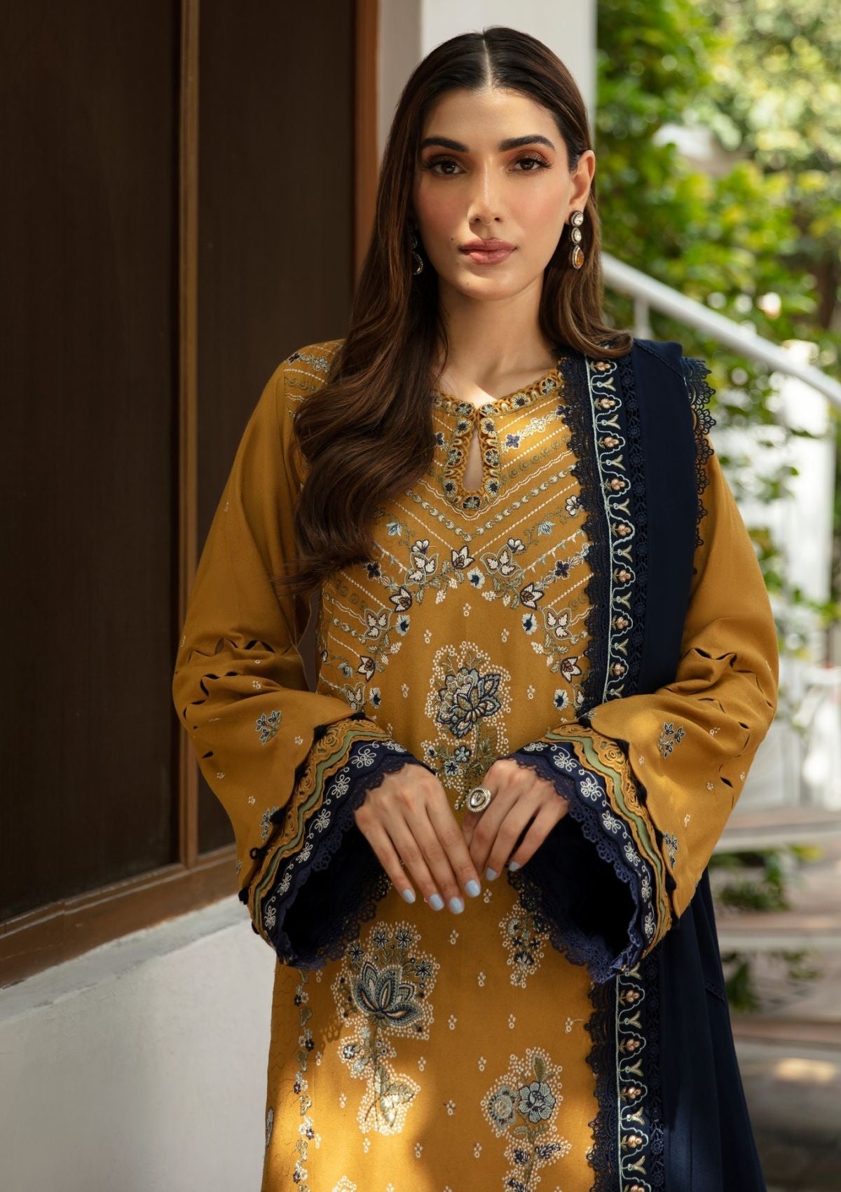 A stunning three-panel mustard shirt unfolds, exuding radiant allure and adorned with intricate floral motifs that dance across a vibrant khaddar fabric. This masterpiece is enhanced by exquisite satin stitches and delicate multicolored floral embroidery in soft ivory tones. Complemented by a striking navy blue Viscose shawl, the ensemble is elevated further with bold, swirling four-sided floral designs in vivid hues, creating a breathtaking look that truly captures the essence of artistry and style.