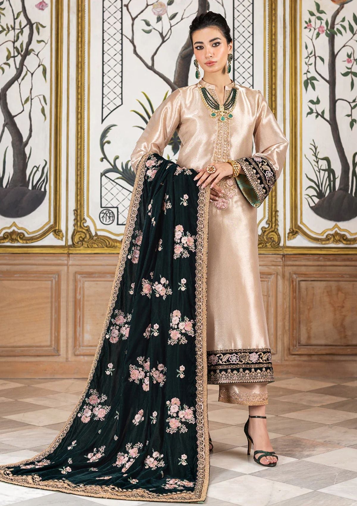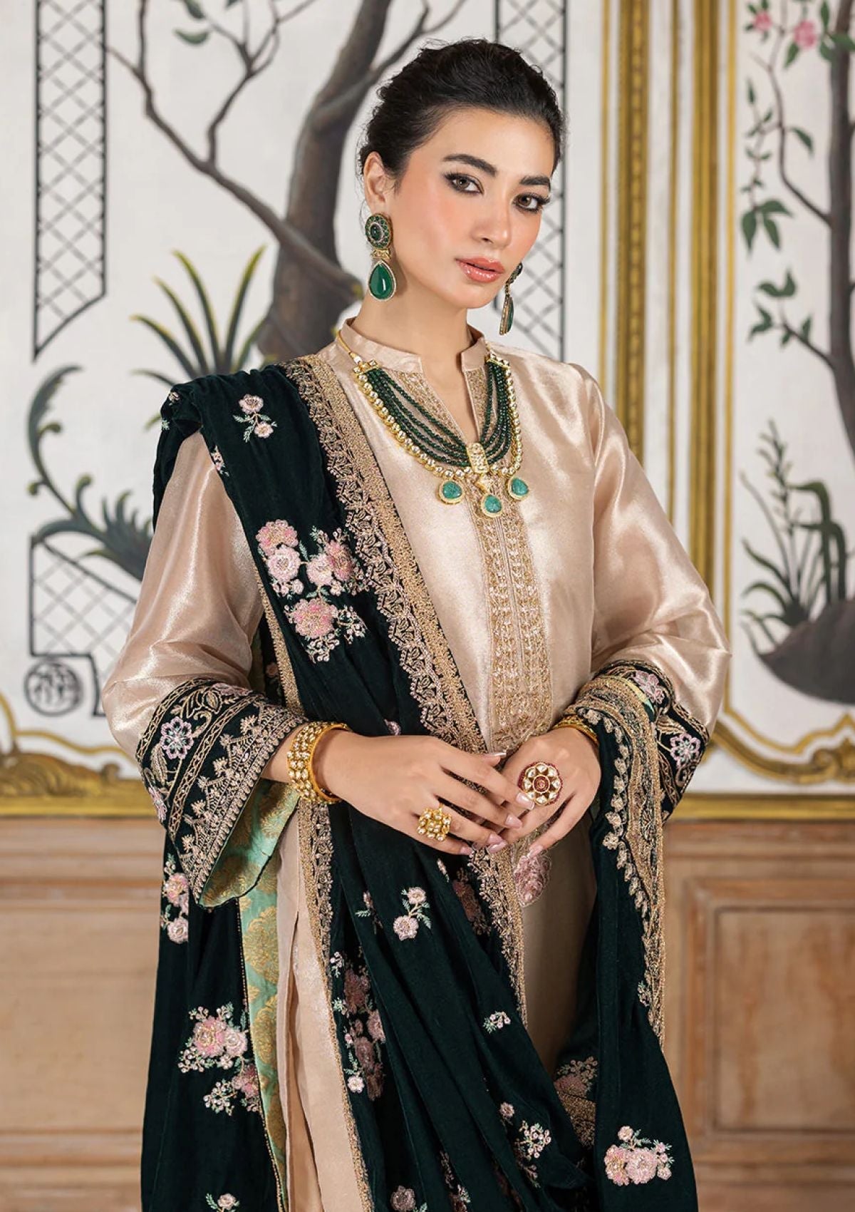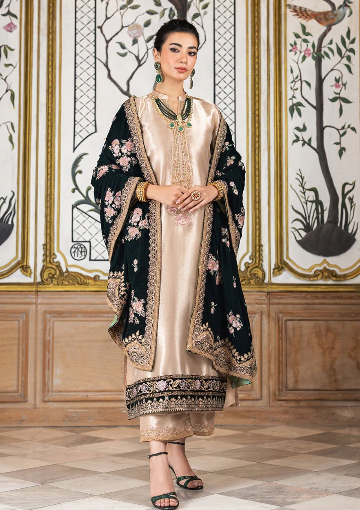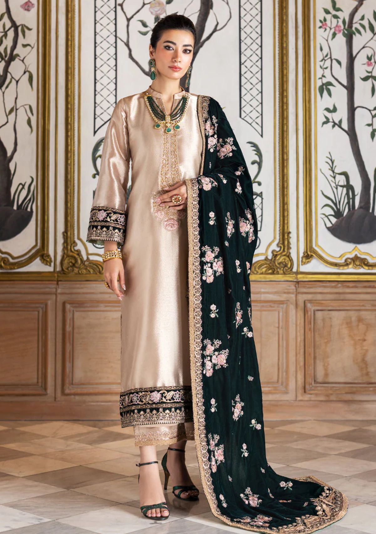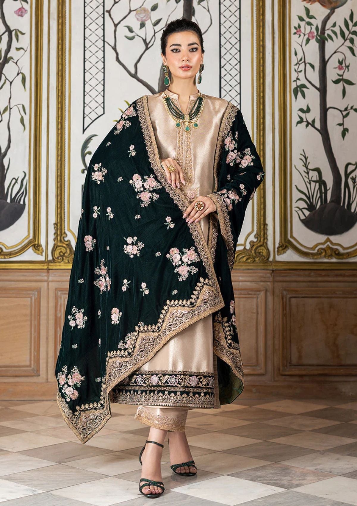 An exquisite ivory ensemble crafted from luxurious brocade fabric, adorned with intricate embroidery on the neckline, sleeves, and hemline, adding an elegant charm to the attire. The delicate work on the hem enhances its refined silhouette. Complementing the ensemble is a stunning contrast of emerald velvet shawl, featuring subtle hints of pink with golden motifs scattered gracefully across, bringing a touch of regality to the look. This ensemble is a perfect blend of sophistication and grandeur, ideal for formal events or festive occasions.