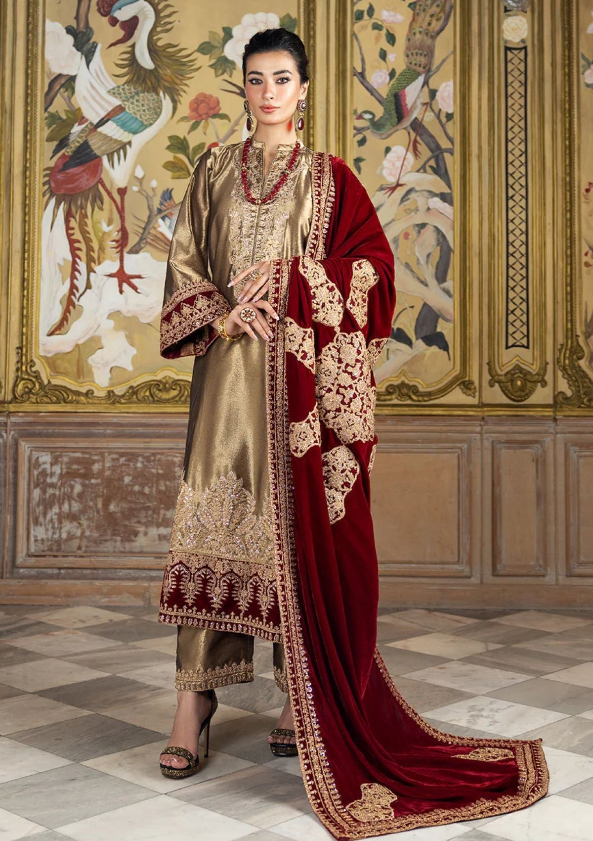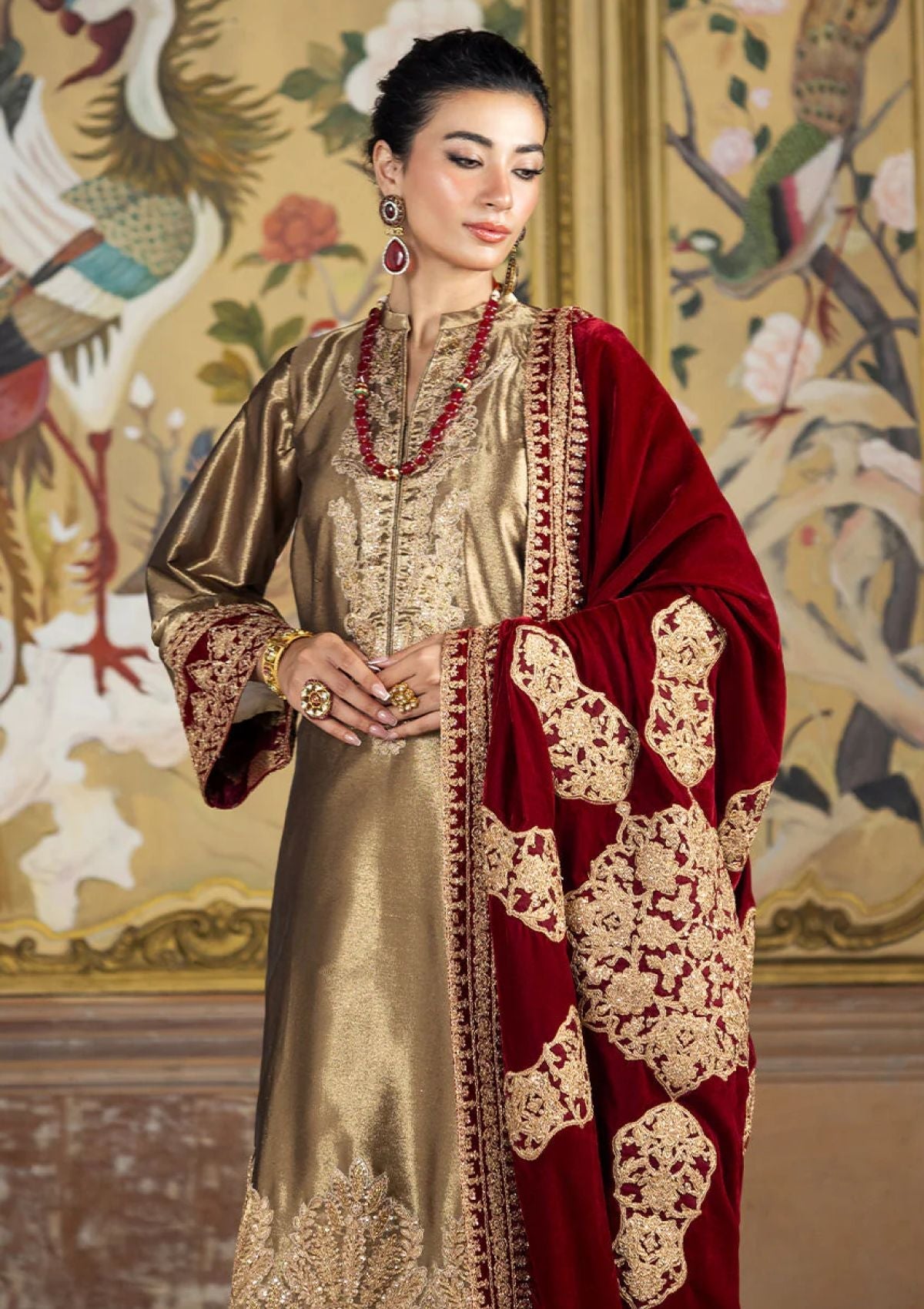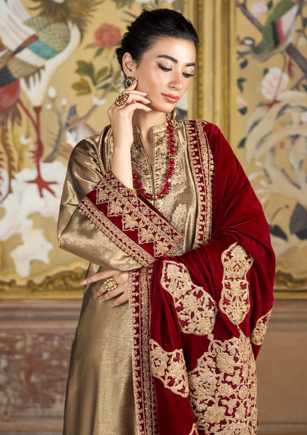 A regal golden ensemble crafted from luxurious brocade fabric, radiating elegance through its intricate embroidery details adorning the neckline, sleeves, and hem. The delicate craftsmanship enhances the rich texture, exuding sophistication with every stitch. Paired gracefully with a vibrant maroon velvet shawl, the ensemble is elevated by the shawl's ornate golden motifs, adding a touch of opulence. This striking combination of warm gold and deep maroon creates a timeless and festive look for all winter celebrations.
