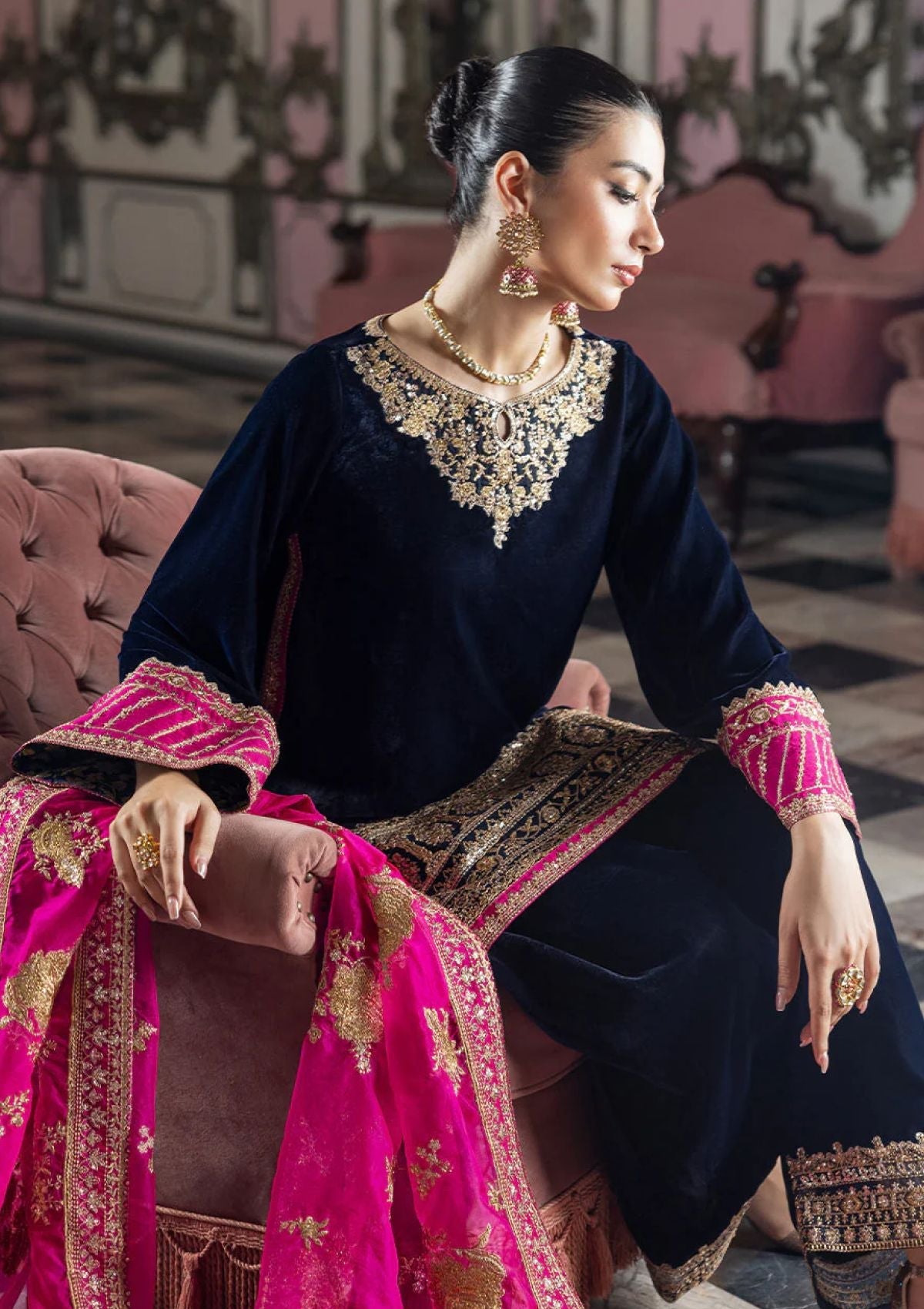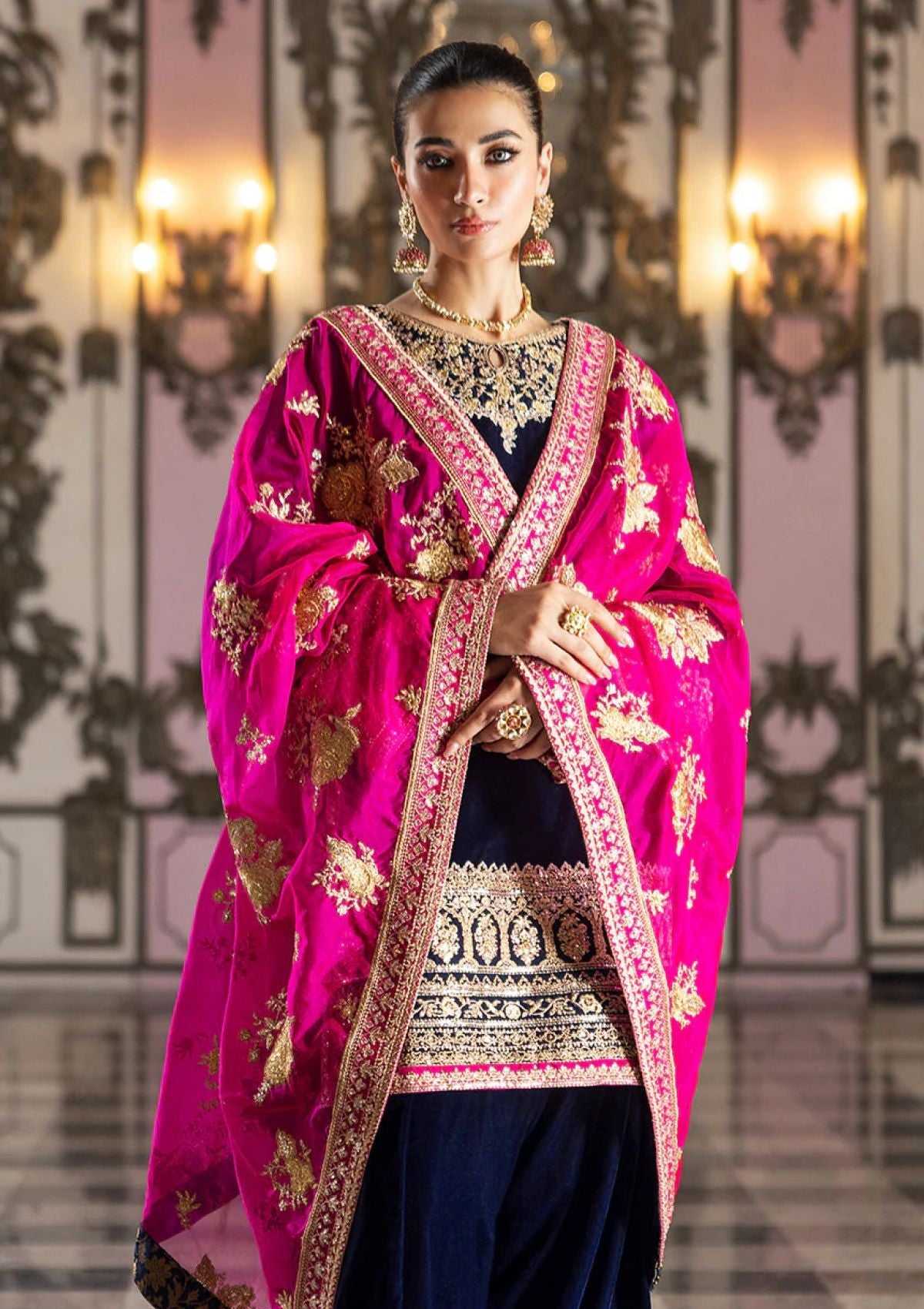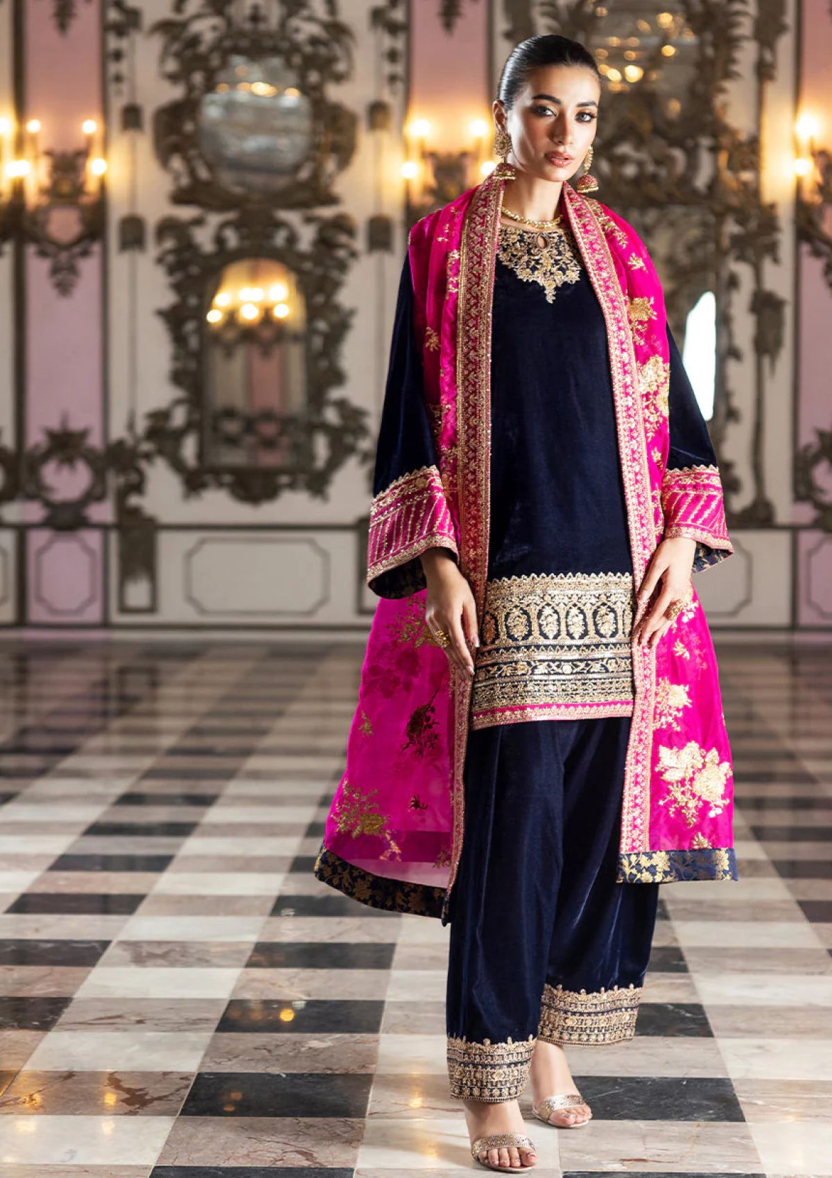 This sophisticated navy blue ensemble, crafted from sumptuous velvet, offers a perfect blend of elegance and charm. The shirt and shalwar feature delicate embroidery, enhanced with eye-catching hot pink accents that lend a vibrant touch to the deep, rich fabric. Complementing the outfit with a hot pink organza dupatta, ethereally draped and embellished with golden flower motifs scattered across its surface, adding a luminous touch. balancing the richness of velvet with the playful elegance of hot pink and gold.