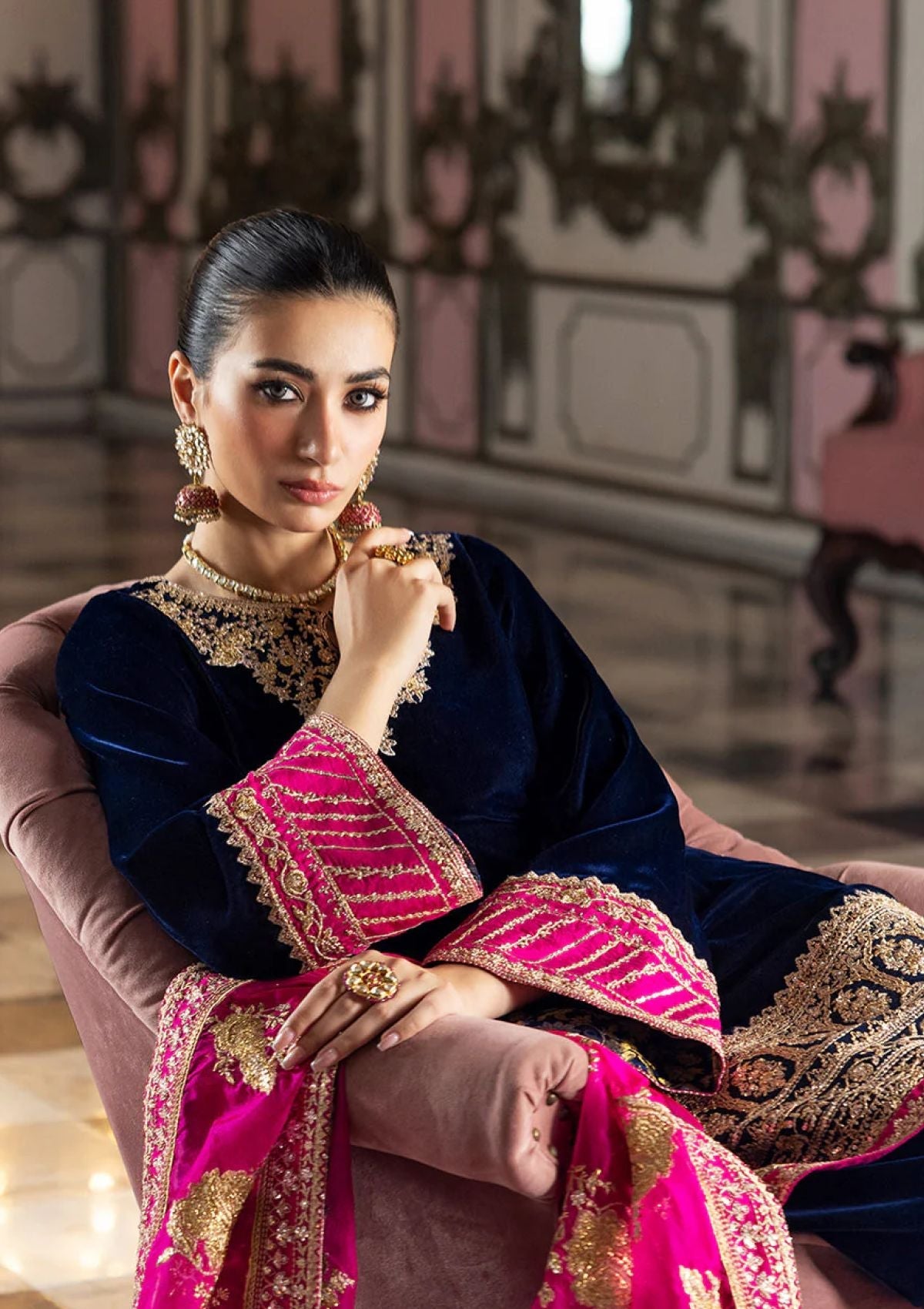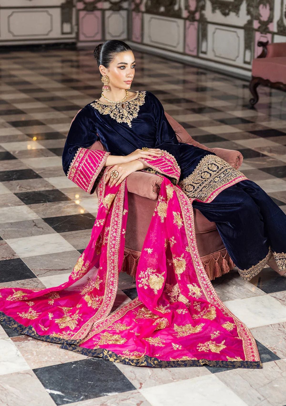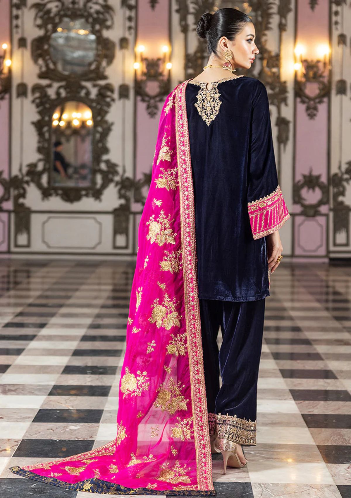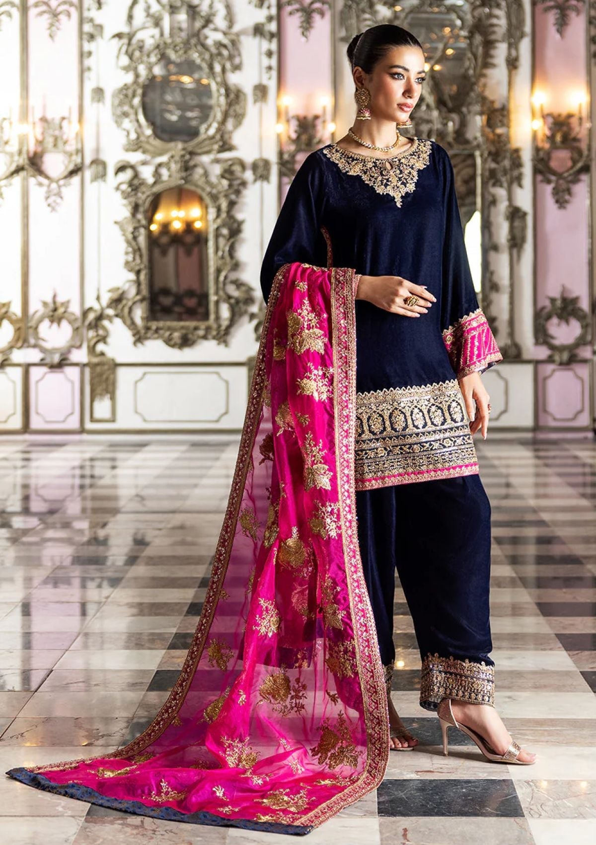 This sophisticated navy blue ensemble, crafted from sumptuous velvet, offers a perfect blend of elegance and charm. The shirt and shalwar feature delicate embroidery, enhanced with eye-catching hot pink accents that lend a vibrant touch to the deep, rich fabric. Complementing the outfit with a hot pink organza dupatta, ethereally draped and embellished with golden flower motifs scattered across its surface, adding a luminous touch. balancing the richness of velvet with the playful elegance of hot pink and gold.