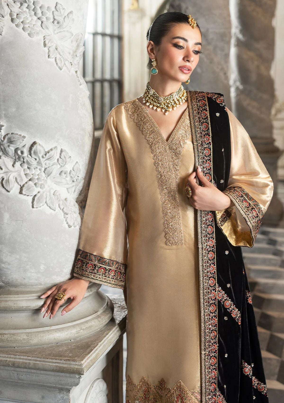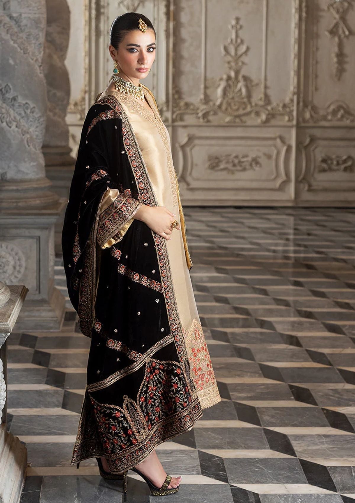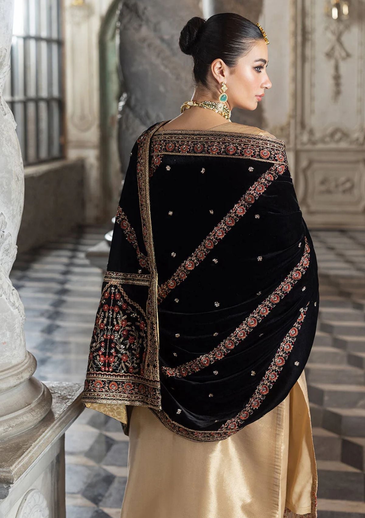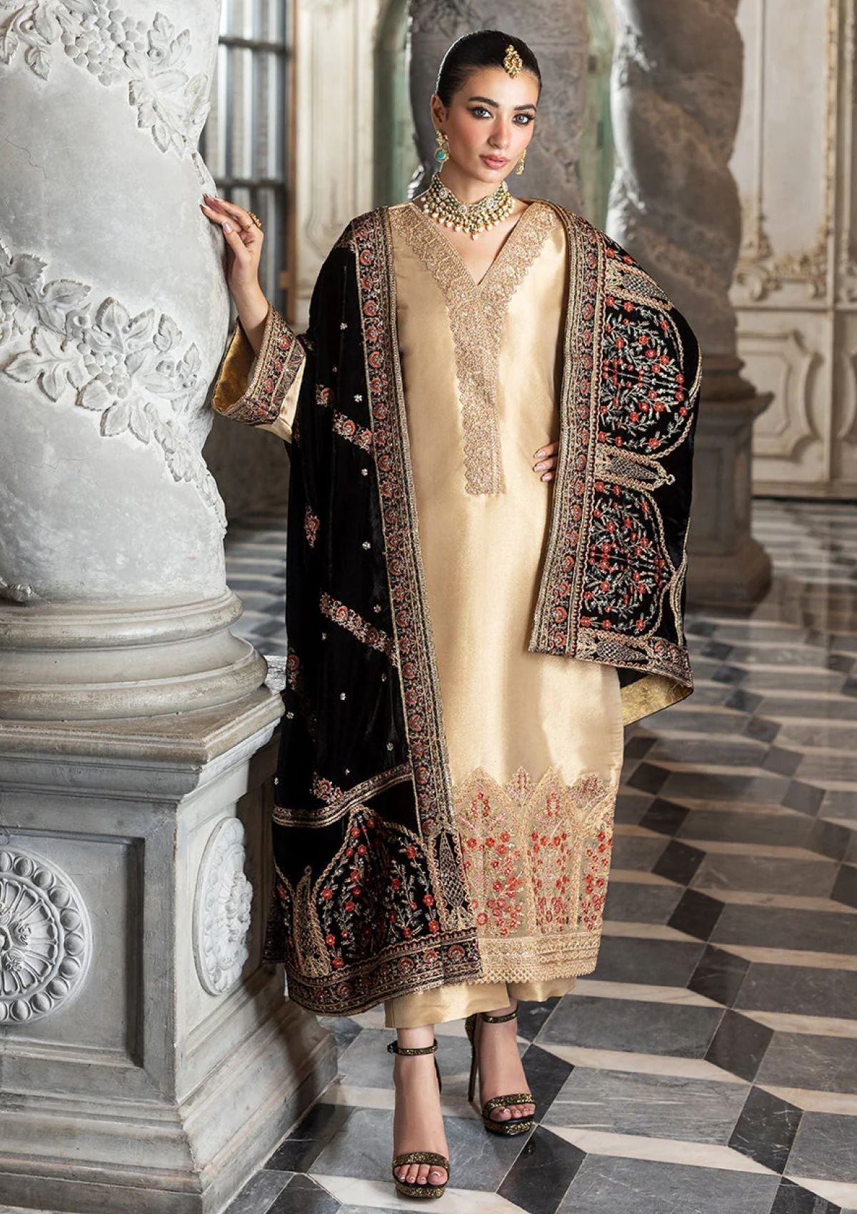 The refined ivory ensemble is tailored from exquisite brocade fabric, offering a rich texture and subtle sheen. The neckline is elegantly embellished with intricate embroidery in a striking palette of black, ivory, and deep red, creating a perfect blend of tradition and sophistication. To elevate the look, the outfit is paired with a luxurious black velvet shawl, meticulously crafted with stunning chari work throughout. The intricate details of the shawl's embroidery add a regal charm, making it the perfect complement to the subtle elegance of the ivory fit. Ideal for winter festivities or formal gatherings.