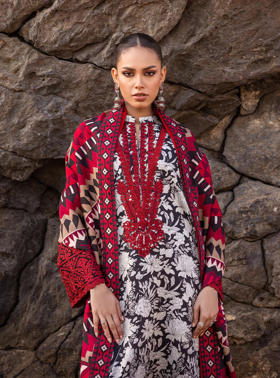 Step into the world of winter sophistication in this eye catchy black and white classic, with delicate red embroidery across the neckline, sleeves and daman. Paired with a shawl not only functional but also serves as a statement accessory that elevates your entire look.