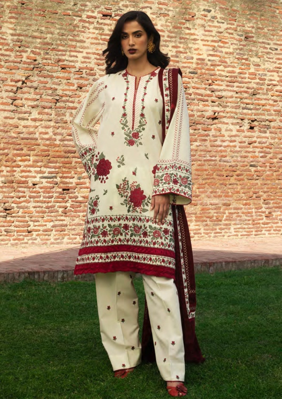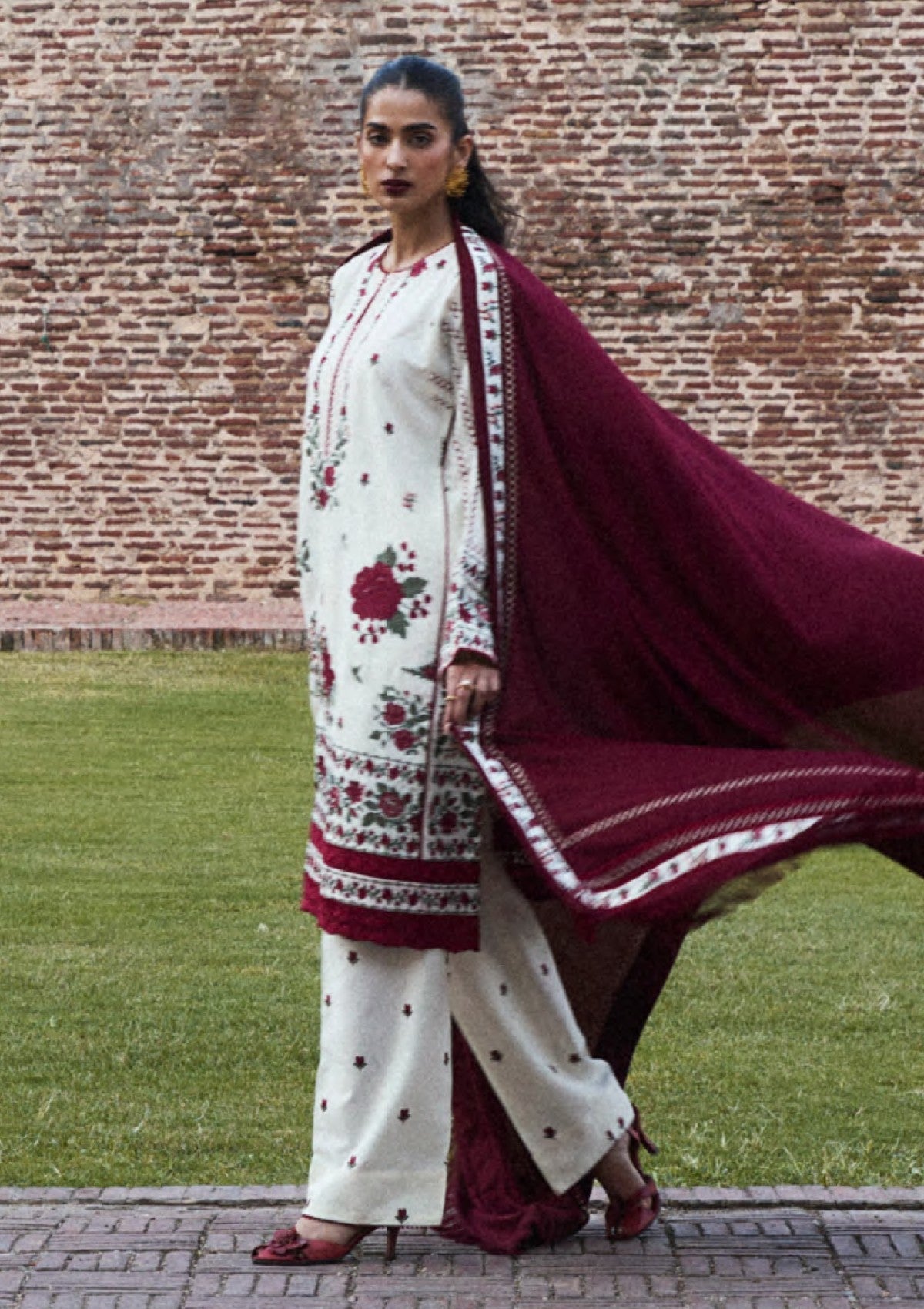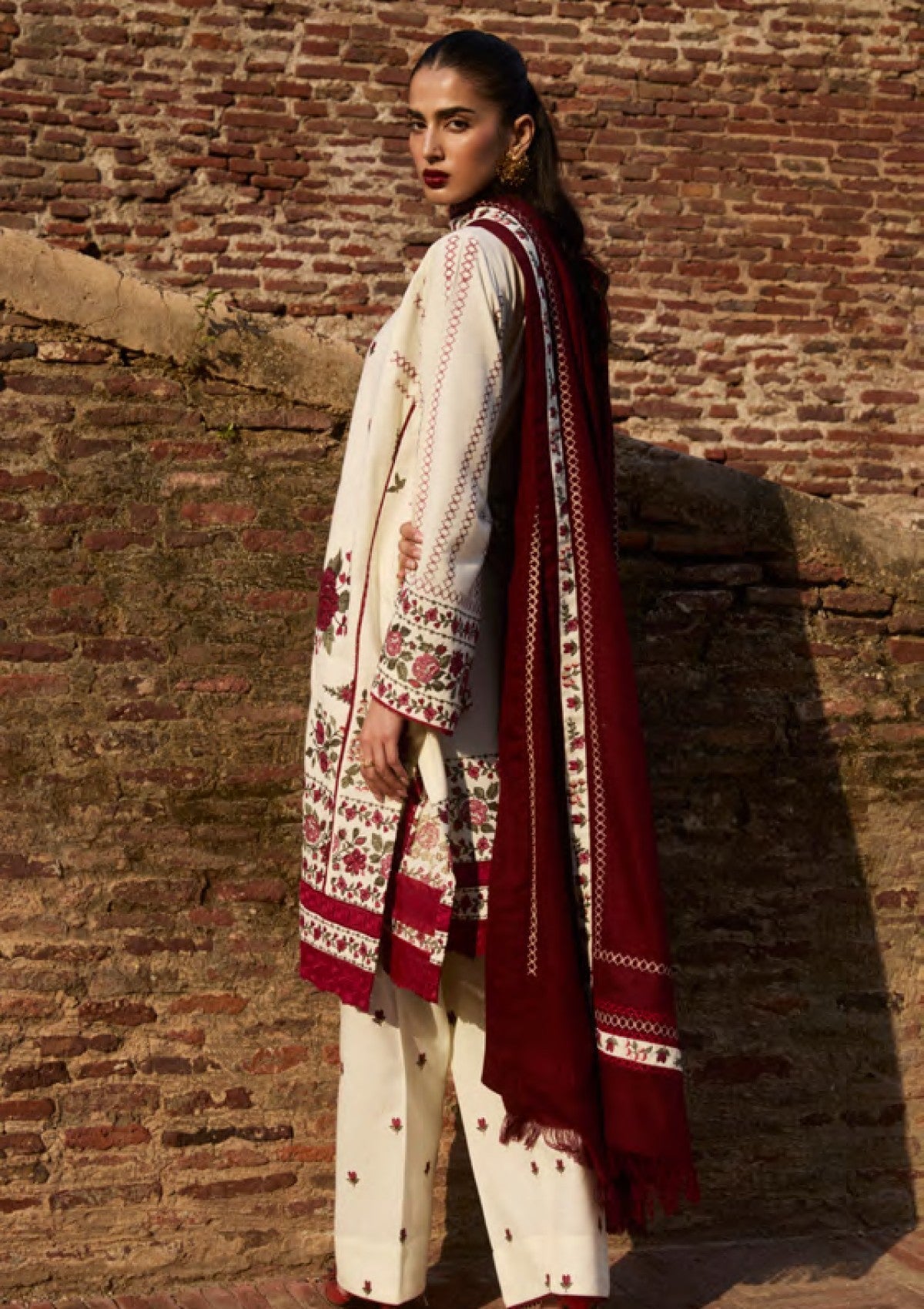 FARIDEH reflects our signature floral patterns embroidered in red on an ivory Khaddar surface with trellis borders on the neck and hemline. It is paired with a deep red wool shawl finished with delicate embroidery on all four sides and styled with an embroidered floral chintz on the shalwar.