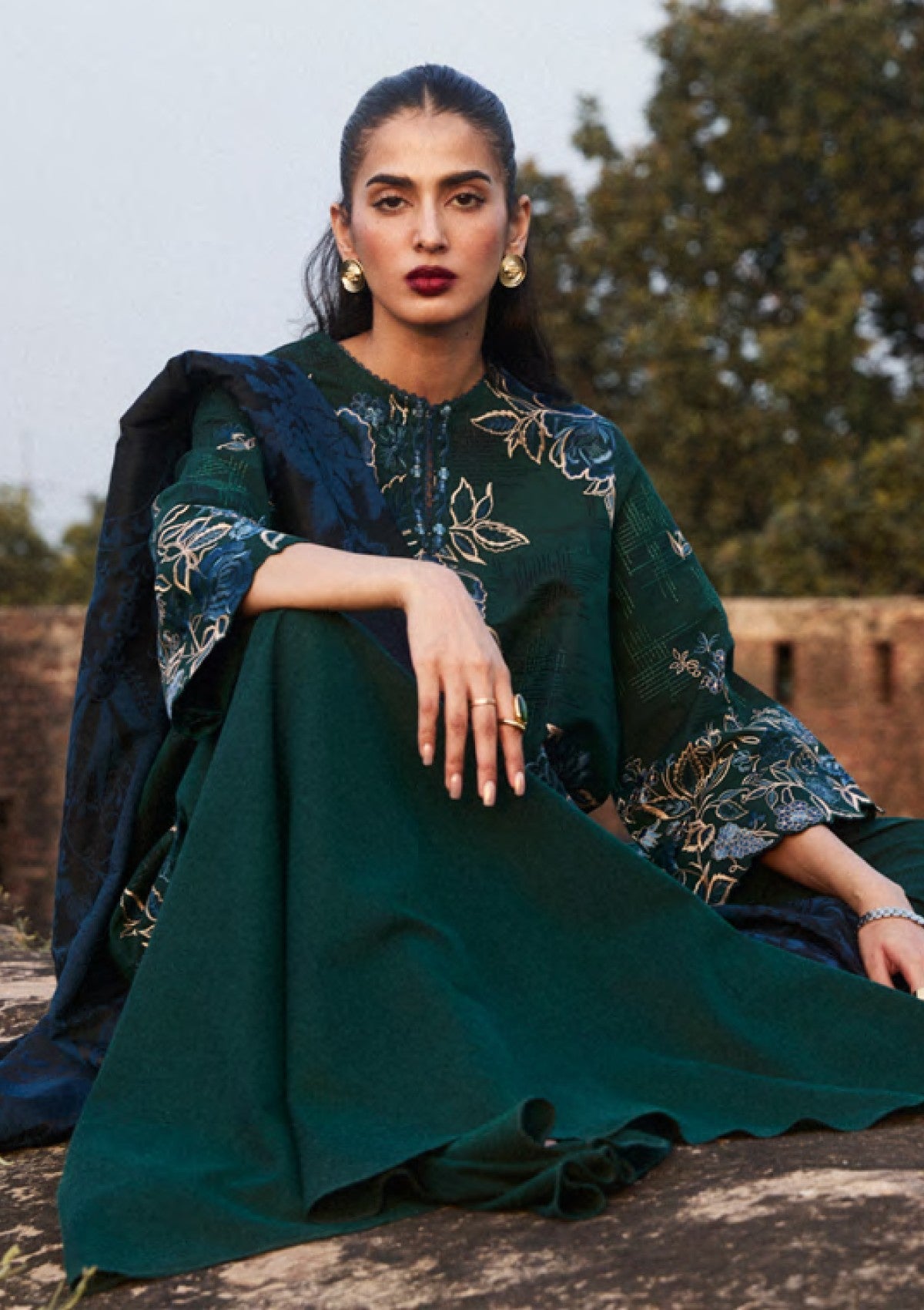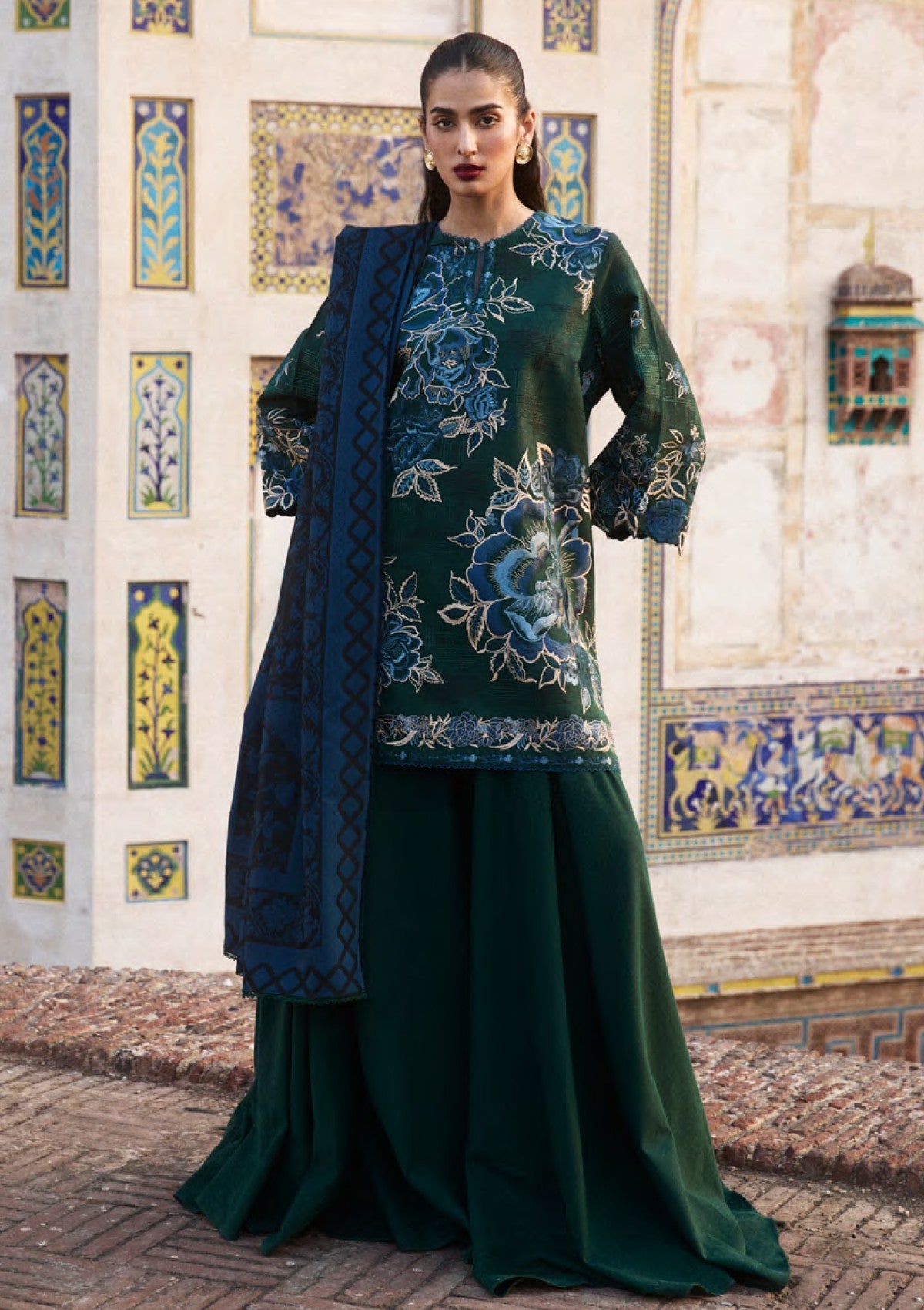 MINA brings us joy by painting the gara flower to life. Embroidered on a solid green khaddar surface with hints of blue, this ensemble is yet another ode to perfection paired with a jacquard shawl.