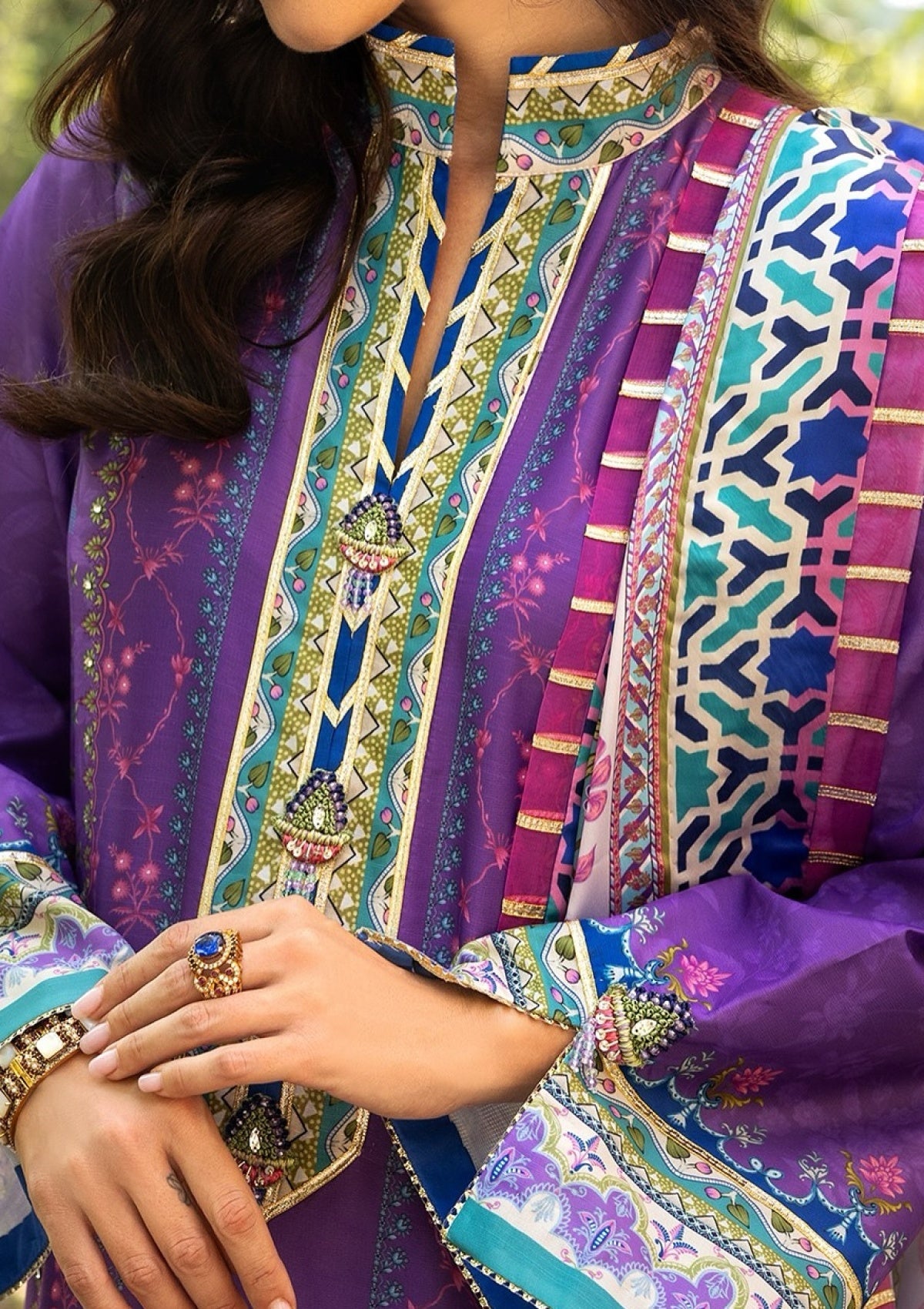 - Hand-embellished neckline buttons